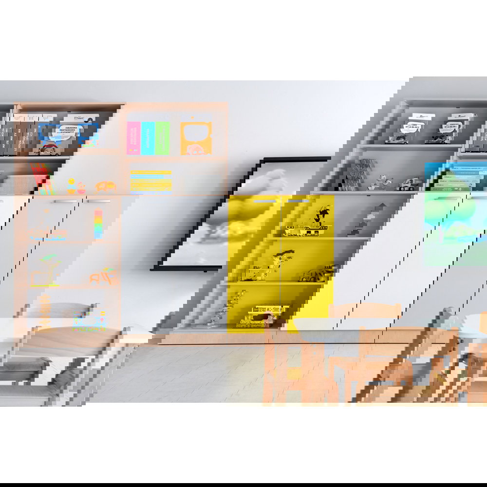 Ein inspirierendes Umfeld braucht mehr als nur Funktionalität – es braucht Farbe und Struktur. Der Möbelsatz Grande 60 (Ahorn Jylland, T 38) bringt genau diese Qualitäten zusammen. Auf einer kompakten Breite von 2,46 Metern entfaltet sich eine dynamische Stauraumlösung, die durch ihr asymmetrisches Design und die fröhliche Farbkombination sofort ins Auge fällt. Das warme Holzdekor des Korpus bildet die ruhige Basis, während Türen in Weiß und sonnigem Gelb lebendige Akzente setzen.