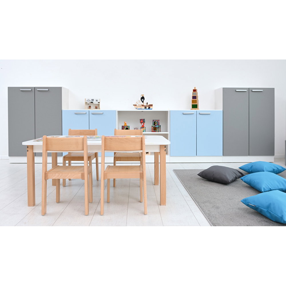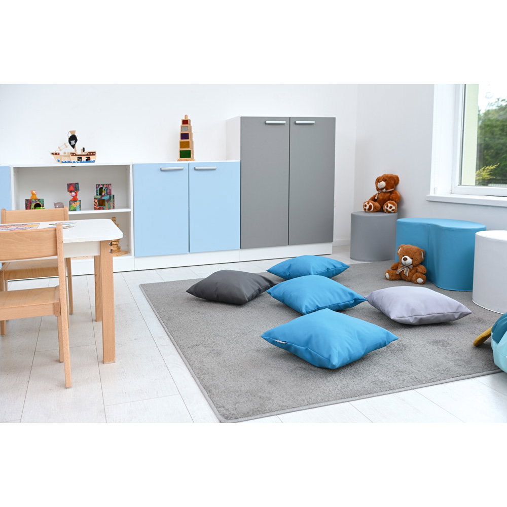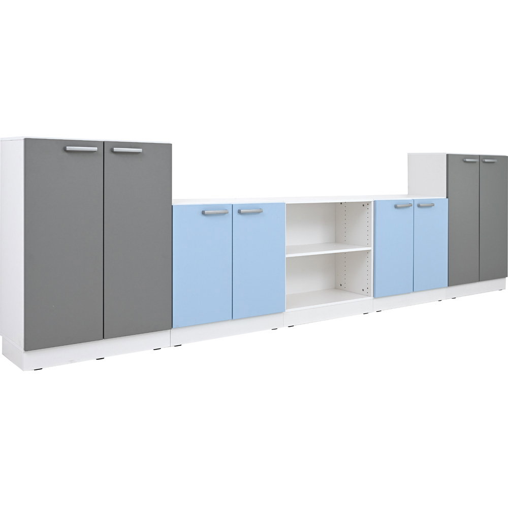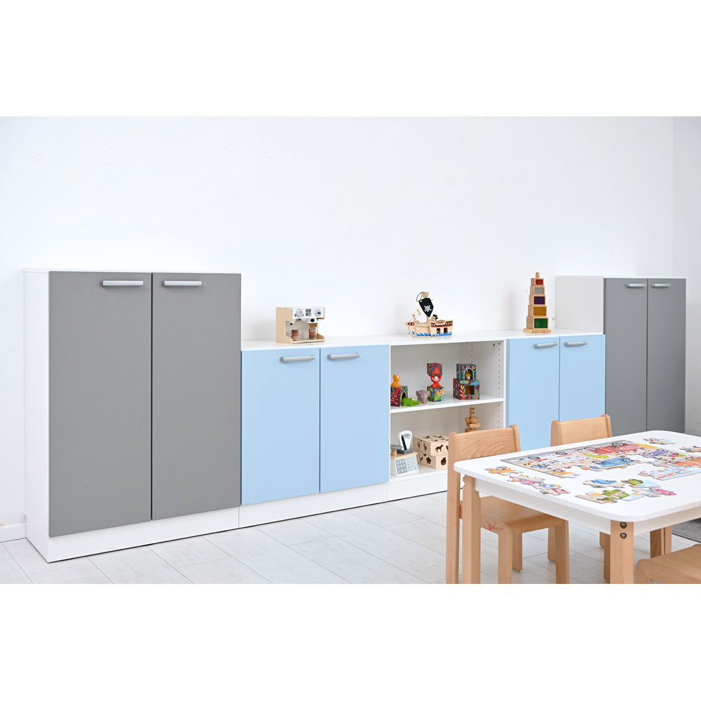 - Geschlossene Elemente: 2 Schränke L mit grauen Türen, 2 Schränke M mit hellblauen Türen.