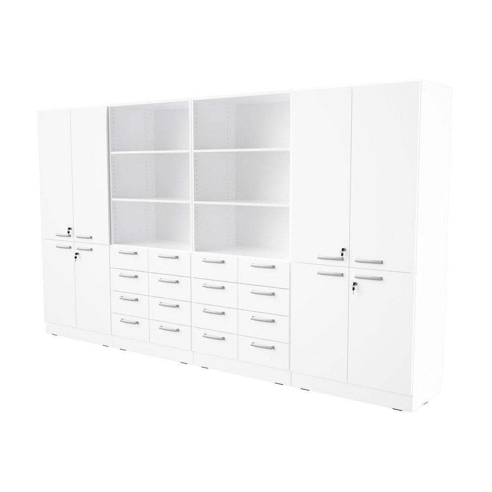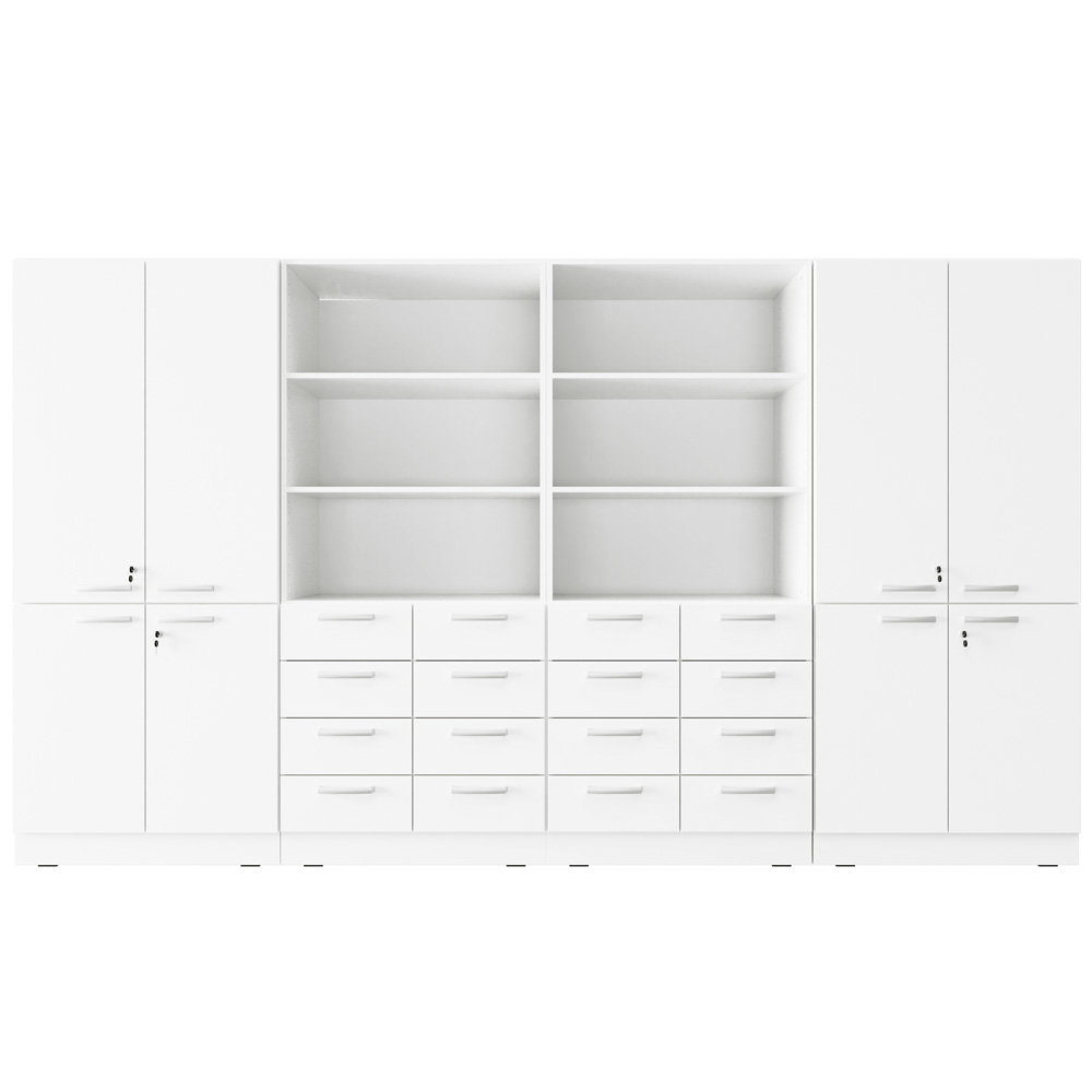 - Zentrum: 2 Schubladenschränke (M) unten, darauf 2 offene Regalaufsätze (L).