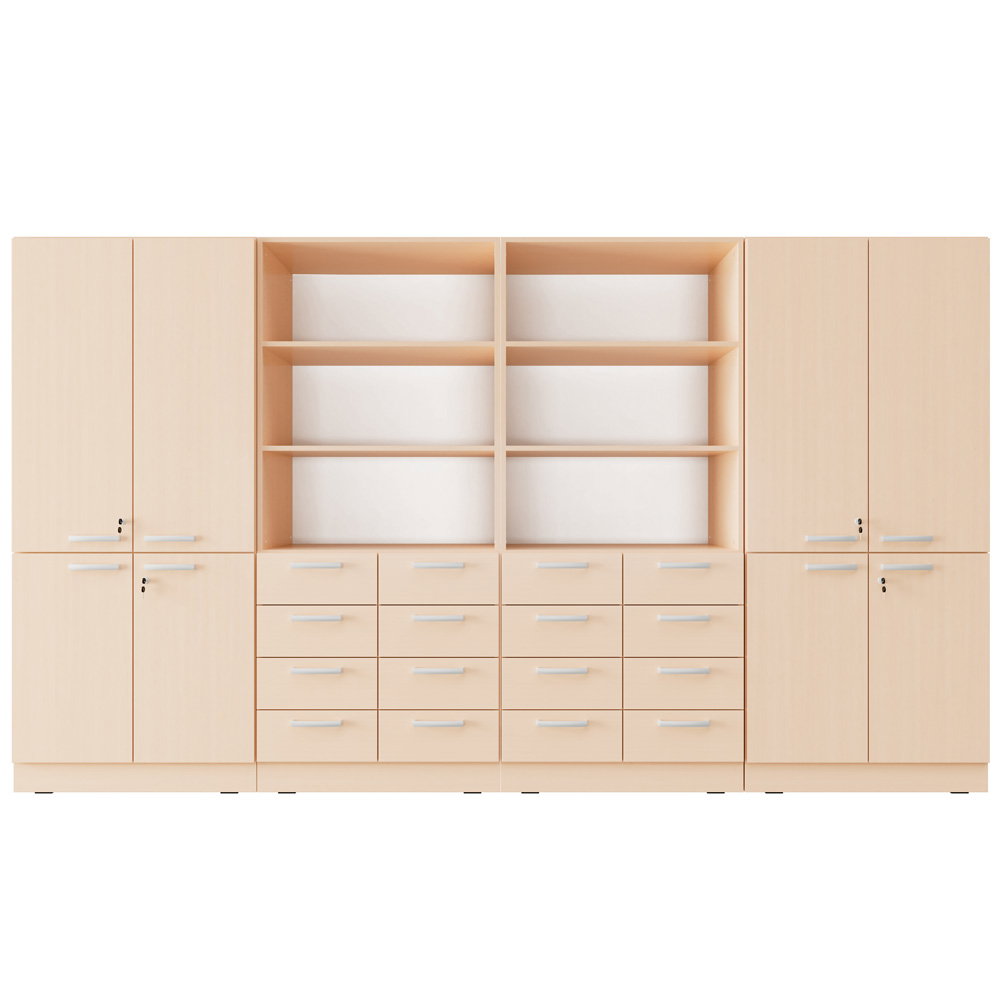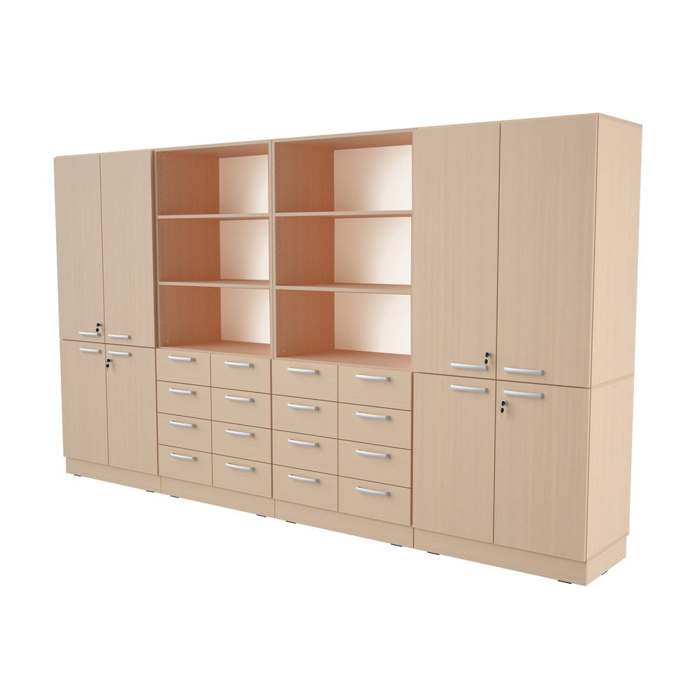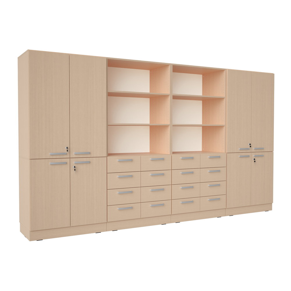 Was dieses Set von anderen unterscheidet, ist die Integration von gleich zwei leistungsstarken Schubladenschränken. Mit insgesamt 16 Schubladen, ausgestattet mit modernster Soft-Close-Technologie, bietet es unübertroffene Möglichkeiten, Kleinteile, Formulare, Schreibwaren oder Lehrmaterialien systematisch zu sortieren. Flankiert werden diese Schubladenblöcke von hohen Schrankelementen, die teils offen für den schnellen Zugriff und teils geschlossen für die sichere Verwahrung konzipiert sind. Das Dekor „Ahorn Jylland“ verleiht dem robusten Möbelstück eine warme, natürliche Ausstrahlung, die sich harmonisch in jede Bürolandschaft oder jeden Klassenraum einfügt. Mit einer extra tiefen Bauweise von ca. 50 cm (T 48 Serie) nutzt der Möbelsatz den vorhandenen Platz optimal aus und schluckt mühelos auch große Ordner und sperrige Gegenstände.