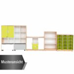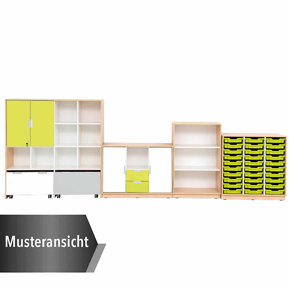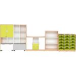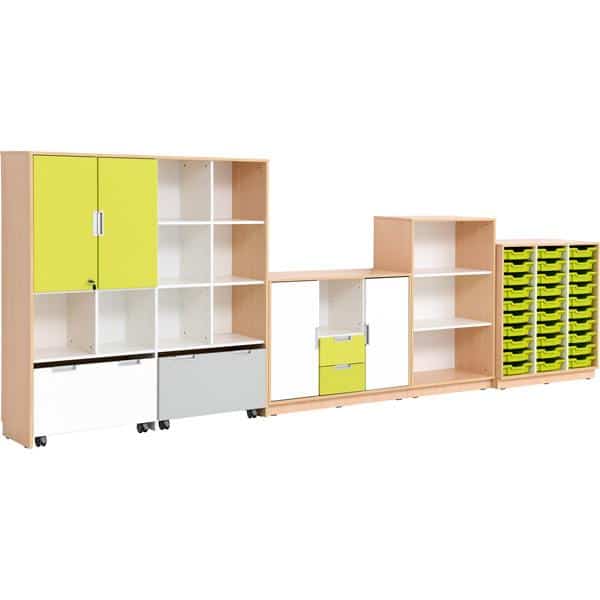 - Farben: Türen in Weiß und Limone; Schubladen in Limone; Rollbehälter in Weiß und Grau; Kunststoffbehälter in Hellgrün