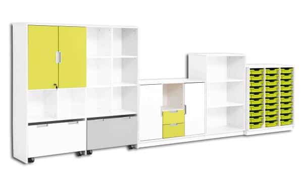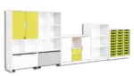 Der Möbelsatz Quadro 181-180° bietet zahlreiche Aufbewahrungsmöglichkeiten und integriert einen abschließbaren Bereich für wertvolle Materialien. Die Roll- und Kunststoffbehälter bieten zusätzlichen Stauraum und schnelle Zugänglichkeit. Durch die stilvollen Limone- und Weiß-Akzente wird eine frische und einladende Atmosphäre geschaffen.