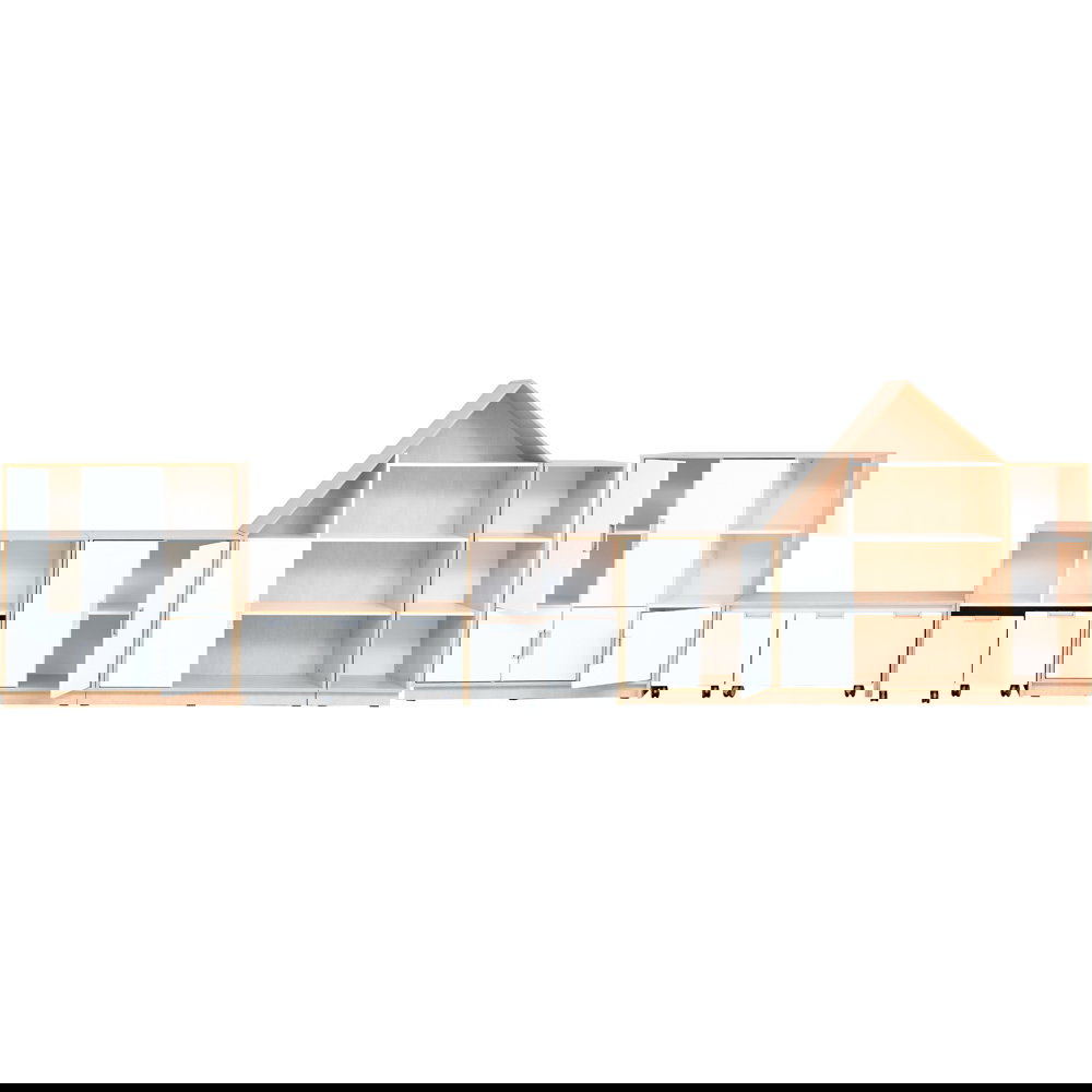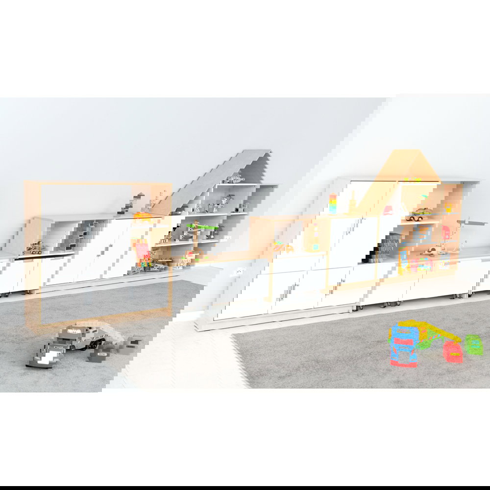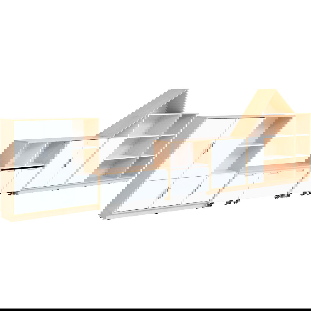 Die Stärke dieses gigantischen Arrangements liegt in seiner unglaublichen Flexibilität. Die Basis bilden verschiedene Schranktypen der Größen S, M und L, die sowohl feste Regalböden als auch spezielle Nischen für mobile Elemente bieten. Ein besonderes Highlight sind die vier mitgelieferten Rollbehälter – drei schmale und ein breiter – die in den dafür vorgesehenen Schränken passgenau Platz finden. Sie können bei Bedarf einfach herausgerollt und als mobile Materialstationen genau dort eingesetzt werden, wo sie gebraucht werden. Ein charmantes Regal in Haus-Optik lockert die große Front spielerisch auf, während ein schmaler L-Schrank auch die kleinste Lücke optimal nutzt. Acht weiße Türen in verschiedenen Größen sorgen für ein ruhiges und aufgeräumtes Erscheinungsbild.