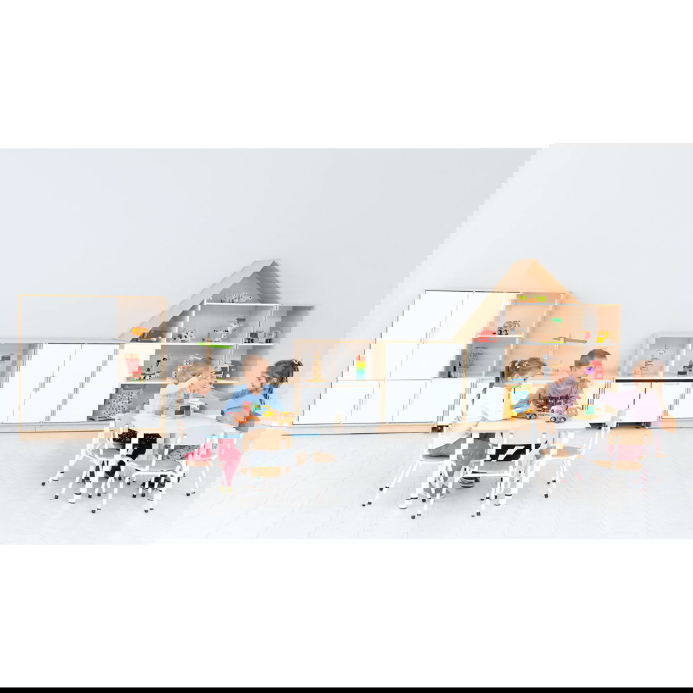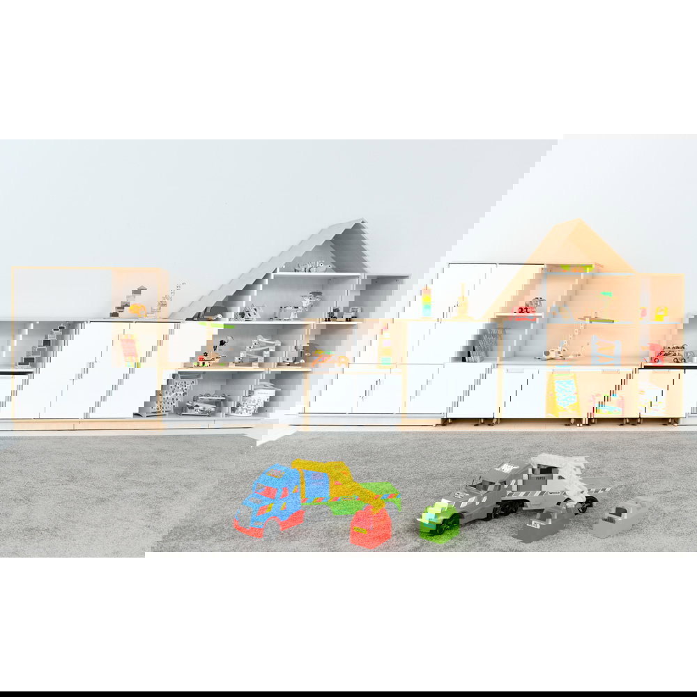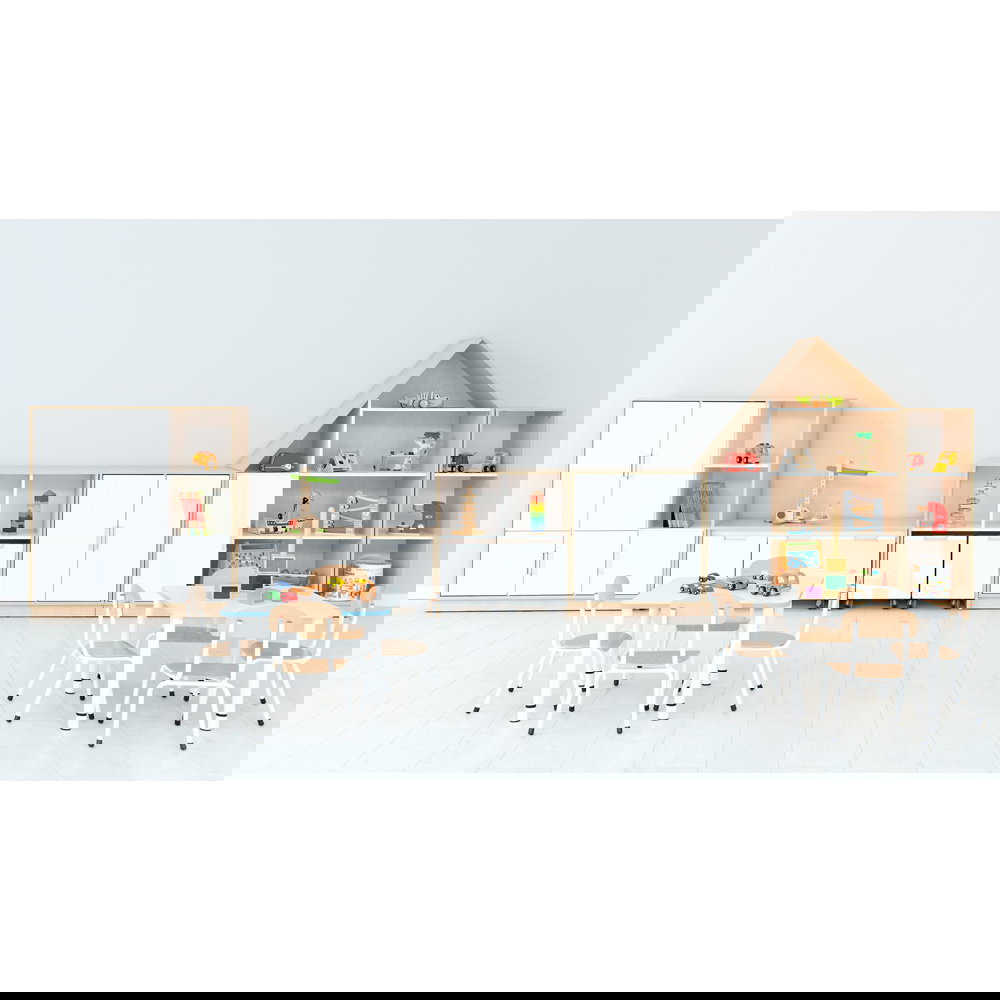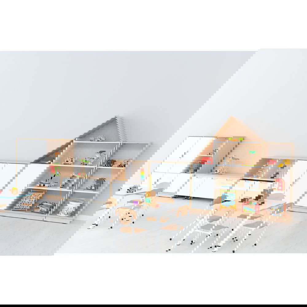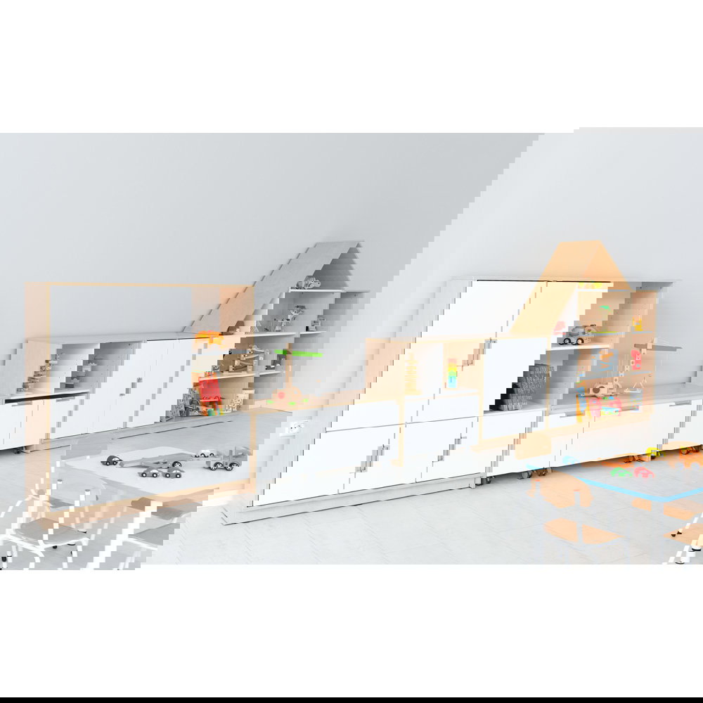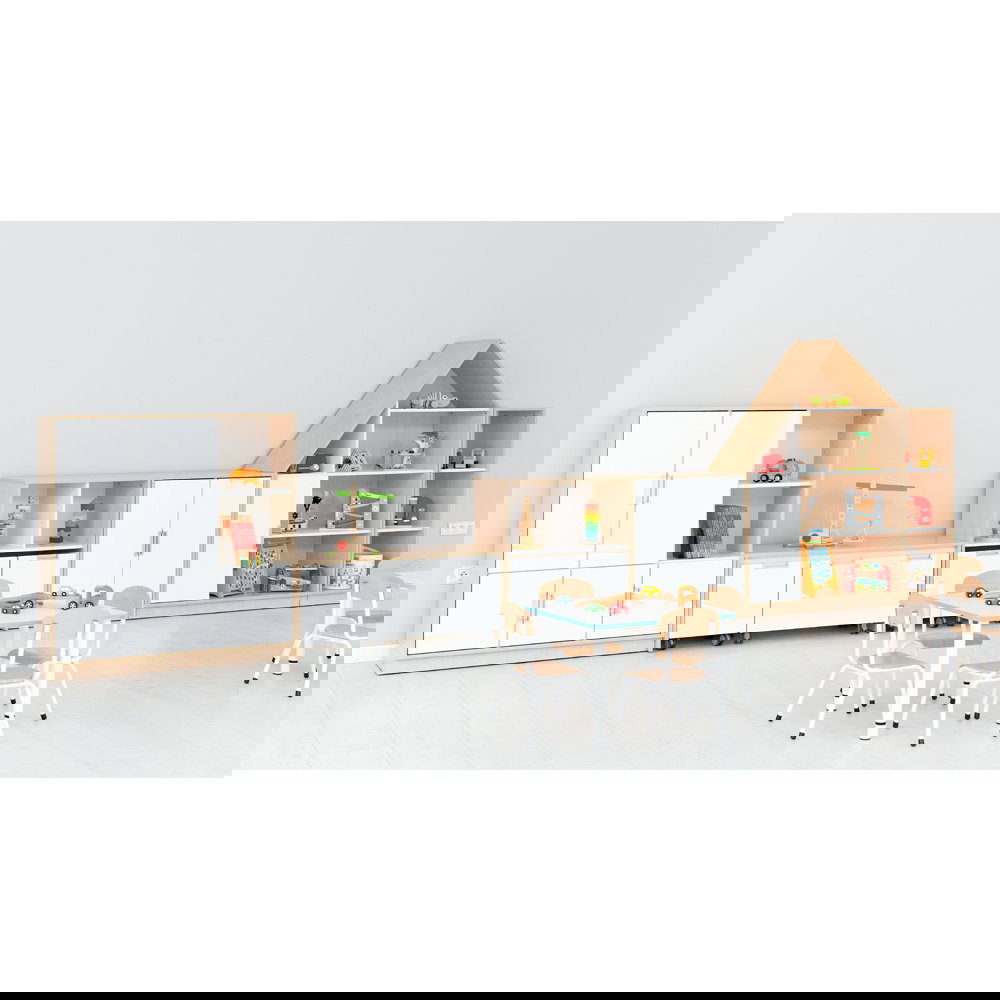 Wählen Sie zwischen warmem Ahorn-Dekor oder modernem Weiß. Die klaren Linien, die weißen Fronten und das verspielte Haus-Regal schaffen eine professionelle und zugleich freundliche Umgebung.