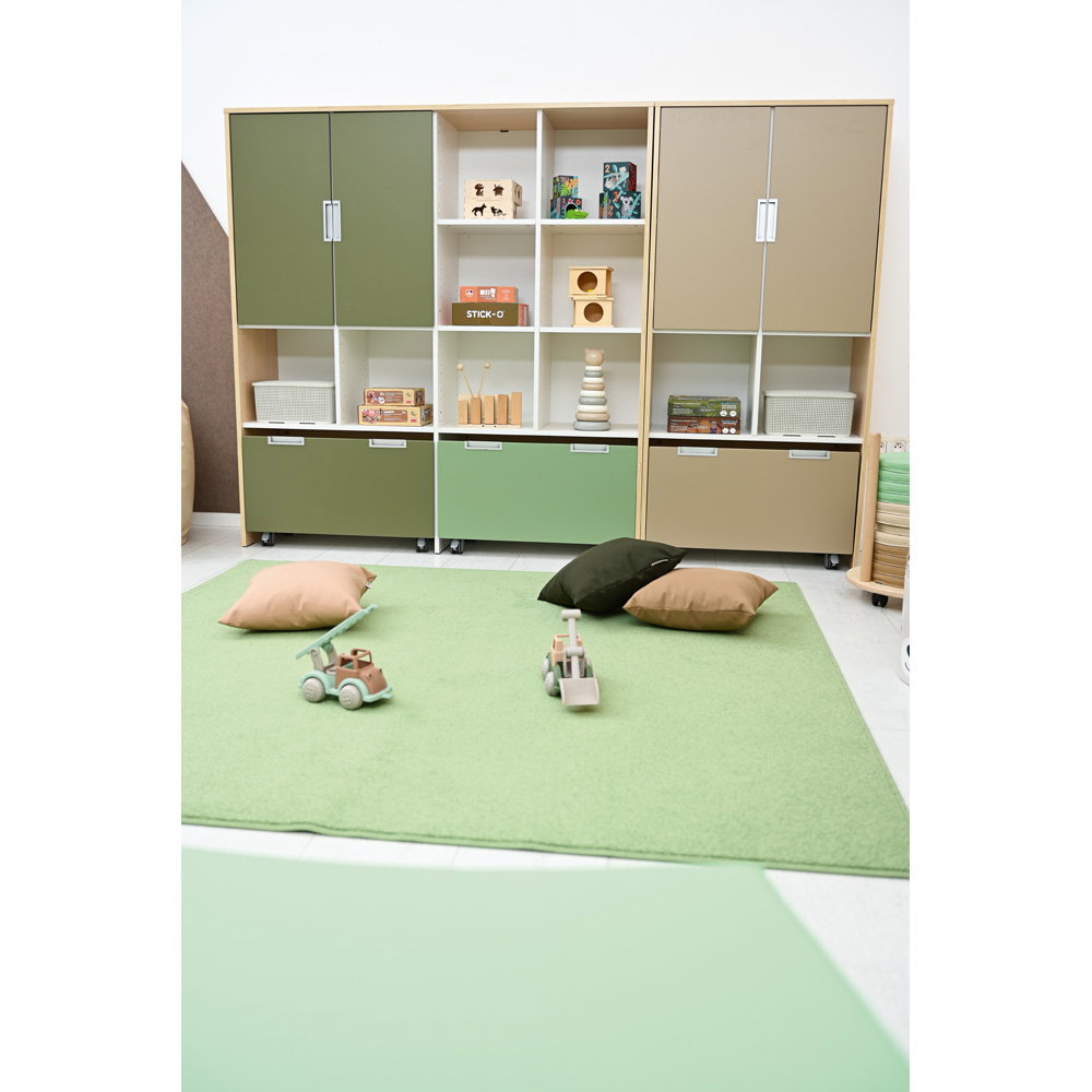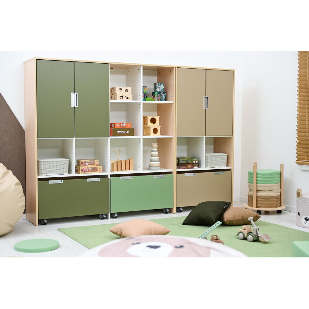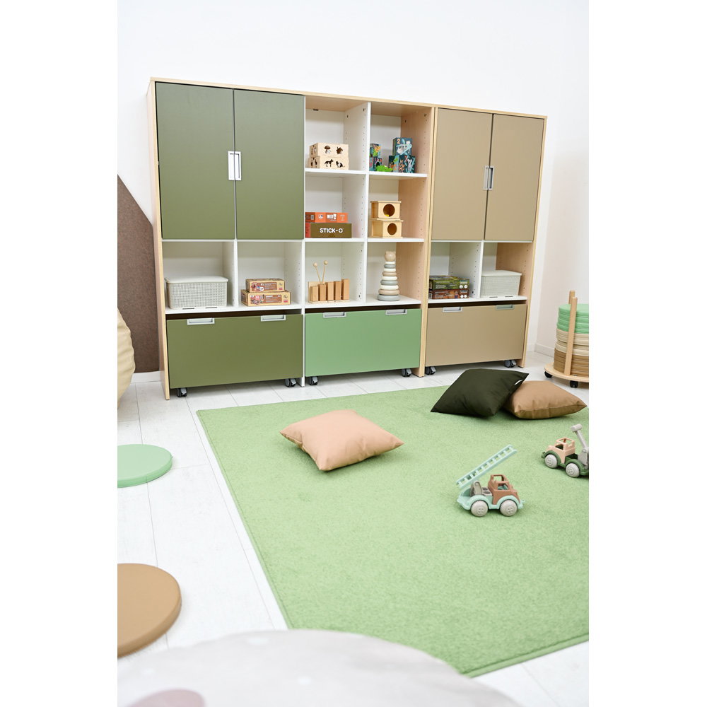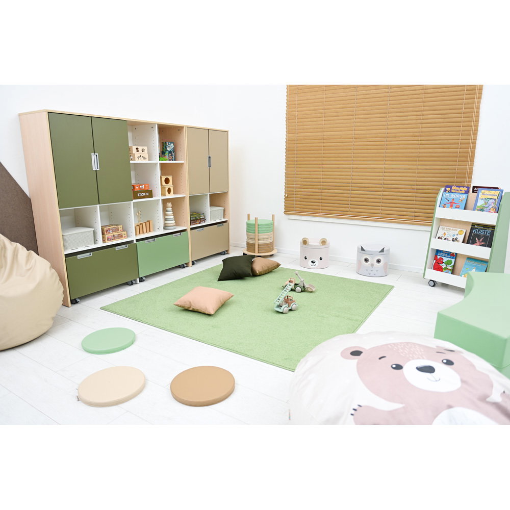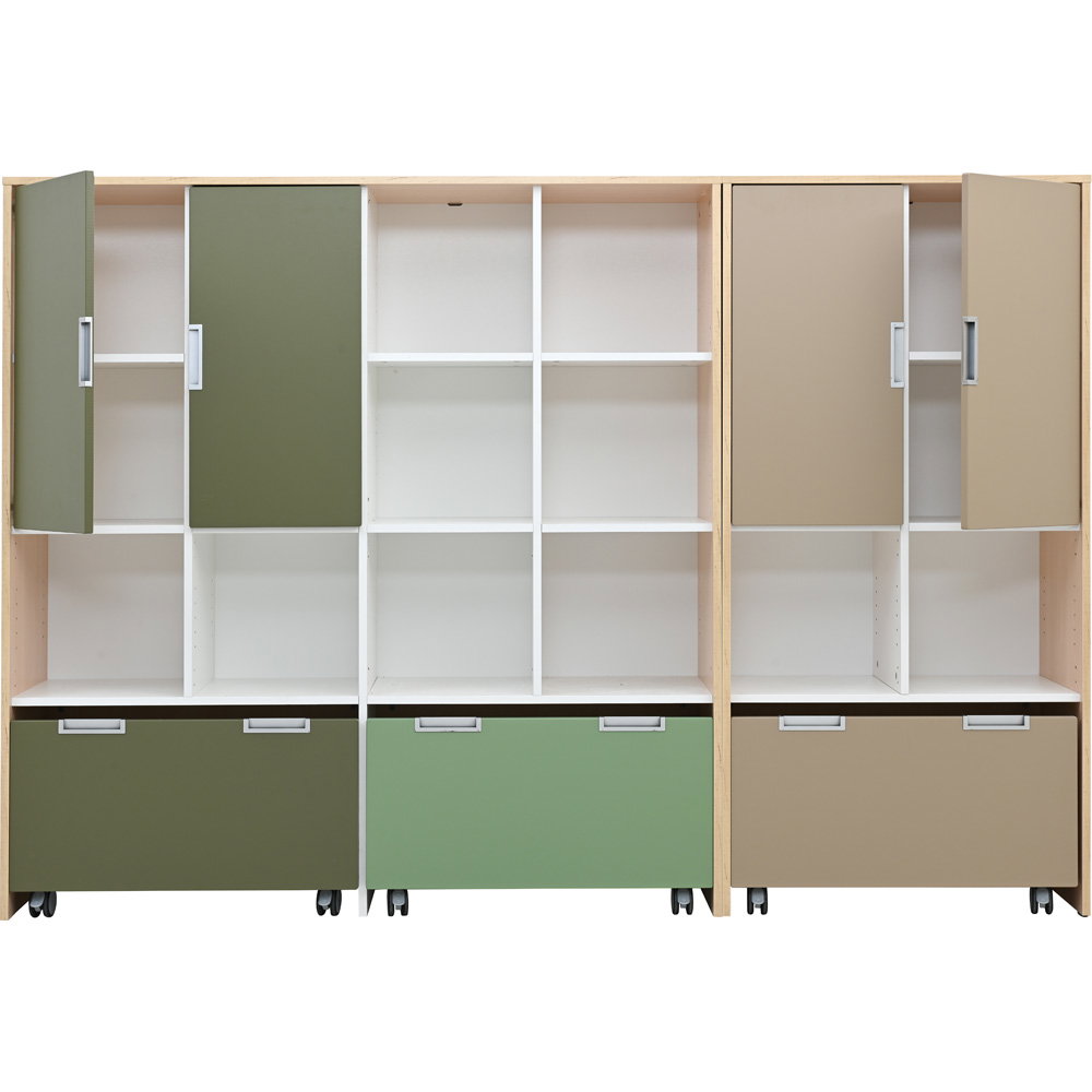 Das funktionale Herzstück dieses Möbelsatzes ist die intelligente Integration von drei breiten Rollbehältern. Diese mobilen Wagen lassen sich nahtlos in die dafür vorgesehenen Nischen der geräumigen XL-Schränke einschieben. Bei Bedarf rollen Sie die Wagen mühelos genau dorthin, wo Bastelmaterialien, Bücher oder Spielzeuge gerade benötigt werden. Ergänzt wird die offene Struktur durch vier mittelgroße Schranktüren, hinter denen sich Alltagsgegenstände ordentlich und sichtgeschützt verstauen lassen. Die Farbgebung der Fronten aus sanftem Hellbraun, beruhigendem Dunkeloliv und frischem Blassgrün holt ein Stück Natur in den Raum und fördert eine konzentrierte, unaufgeregte Wohlfühlatmosphäre.