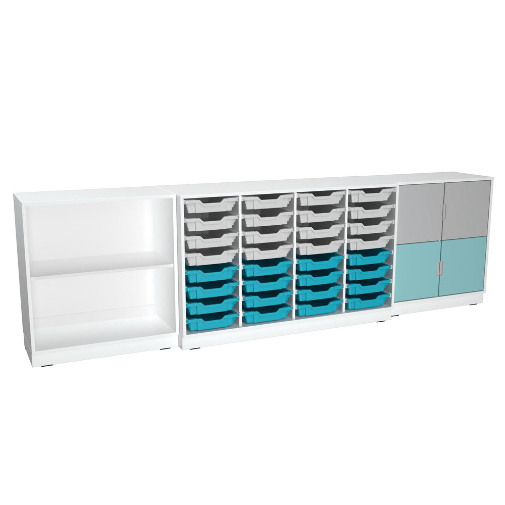 In Räumen, in denen unzählige Kleinteile wie Stifte, Bastelperlen und Bausteine ein Zuhause brauchen, ist ein durchdachtes Ordnungssystem Gold wert. Der Möbelsatz Quadro 297/297W wurde genau für diese Herausforderung entwickelt. Auf einer Breite von knapp drei Metern kombiniert dieses halbhohe Möbel-Arrangement geschlossene Schränke mit einem riesigen Regal für Materialboxen. Mit seiner niedrigen Höhe von unter 90 cm fördert es die Selbstständigkeit der Kinder und hält den Raum offen und übersichtlich. Die beruhigende Farbgebung in Grau- und Türkistönen schafft eine harmonische Atmosphäre, die sich ideal für Kitas, Grundschulen und Therapieräume eignet.
