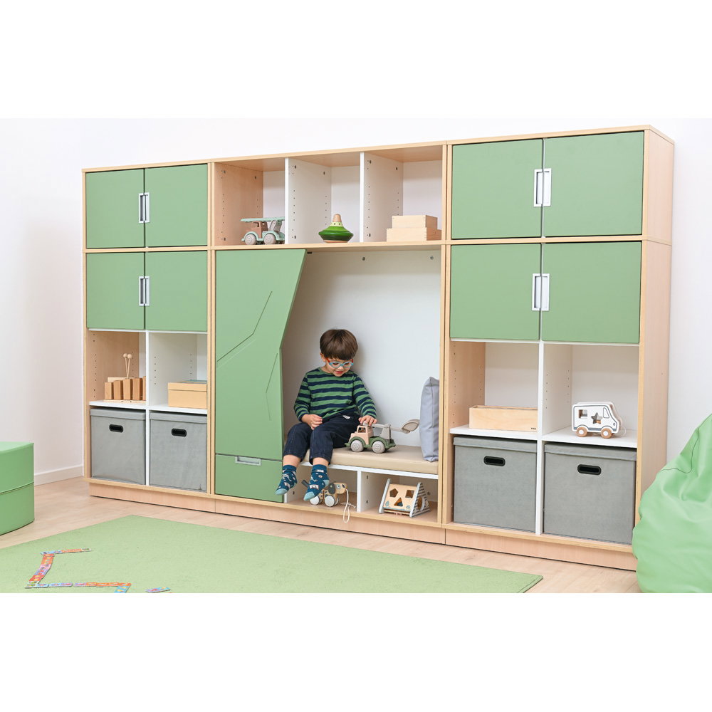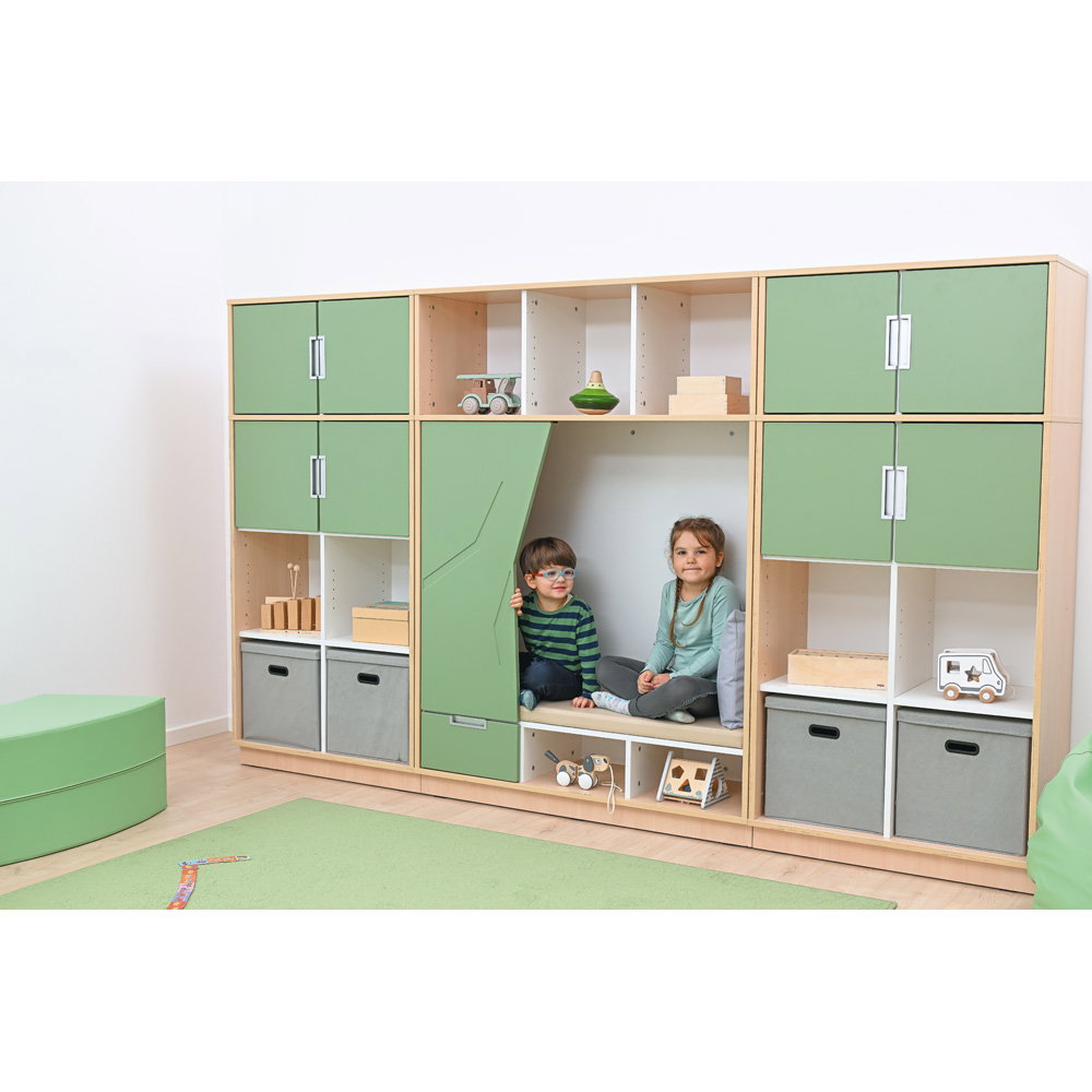 Laminierte Spanplatten, 18 mm starke MDF-Fronten und solide Griffe gewährleisten eine hohe Stabilität und Langlebigkeit, selbst bei intensiver Nutzung in Kitas oder Schulen. - Ruhige und ordentliche Optik