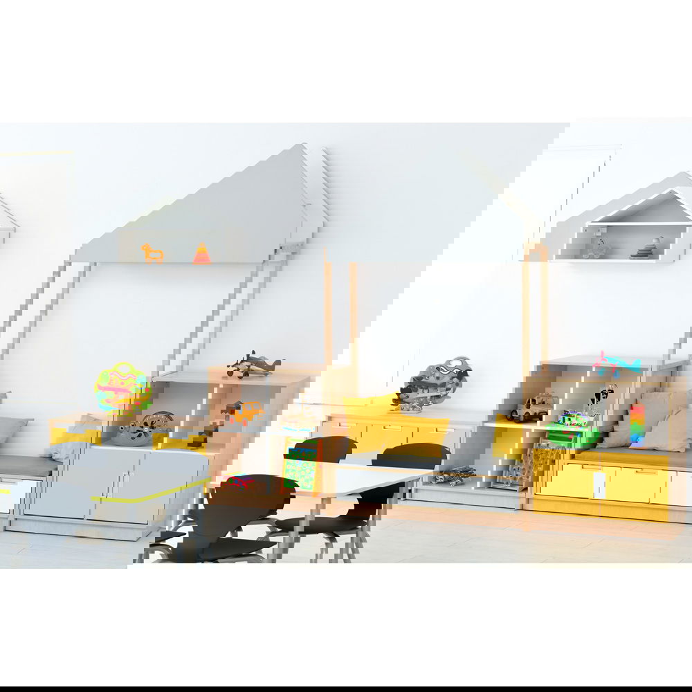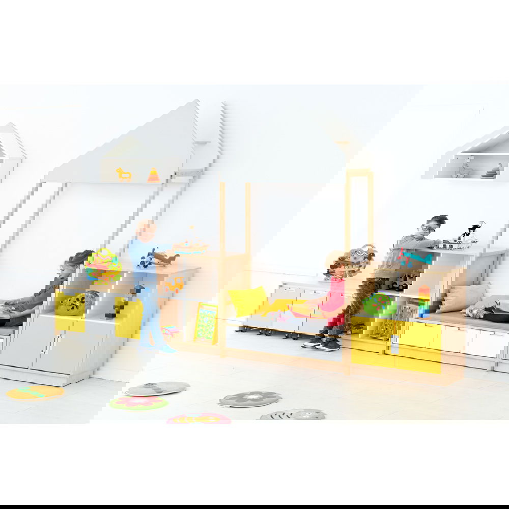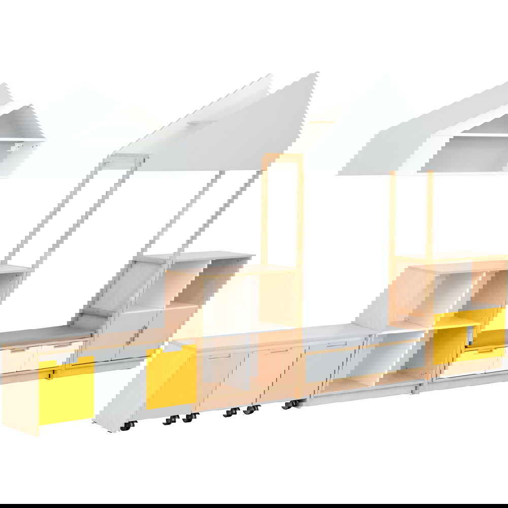 Diese faszinierende „Häuserzeile“ verwandelt eine einfache Schrankwand in ein kleines, freundliches Dorf mitten im Raum. Das Set kombiniert durchdachte Aufbewahrungslösungen wie den praktischen Schrank für Rollbehälter mit gemütlichen Elementen wie einer integrierten Sitzbank. Besondere optische Highlights setzen das Hängeregal in Häuschen-Form und das markante Schmuckdach. Sie verleihen dem Möbelstück eine behagliche, hausähnliche Silhouette. Wir haben dieses modulare System speziell für die hohen pädagogischen und funktionalen Ansprüche in Bildungseinrichtungen entwickelt. Es fügt sich harmonisch in Ihre bestehende Einrichtung ein und unterstützt Sie jeden Tag dabei, eine aufgeräumte und gleichzeitig inspirierende Wohlfühlatmosphäre zu erhalten.