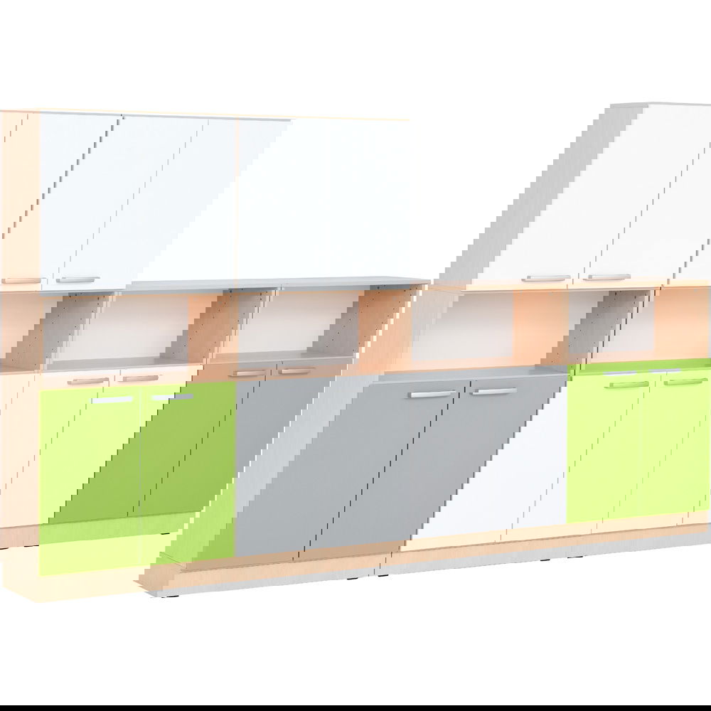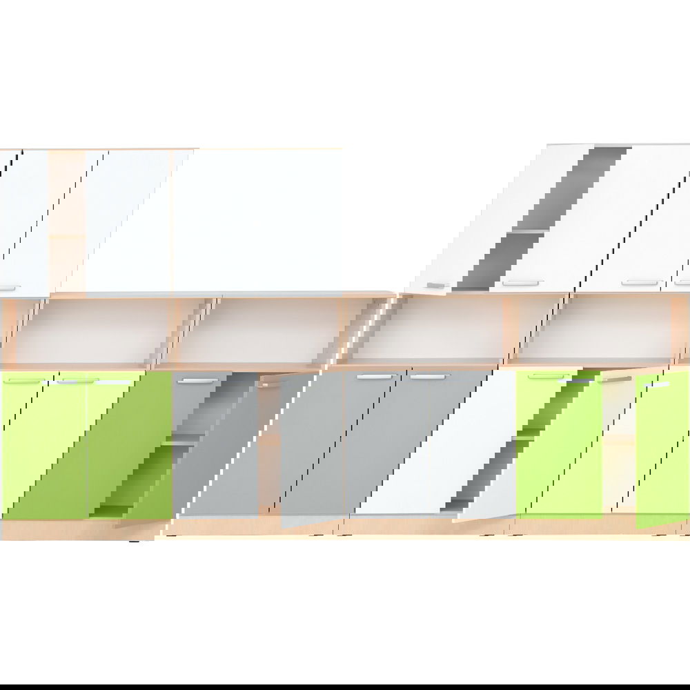- Türen: Öffnungswinkel 90°. 4 Paare in Weiß, 2 Paare in Grün. (Hinweis: Es werden mehr Korpusse (M) als spezifische Türen-Sets geliefert. Die Türen werden flexibel auf die M-Korpusse verteilt.)