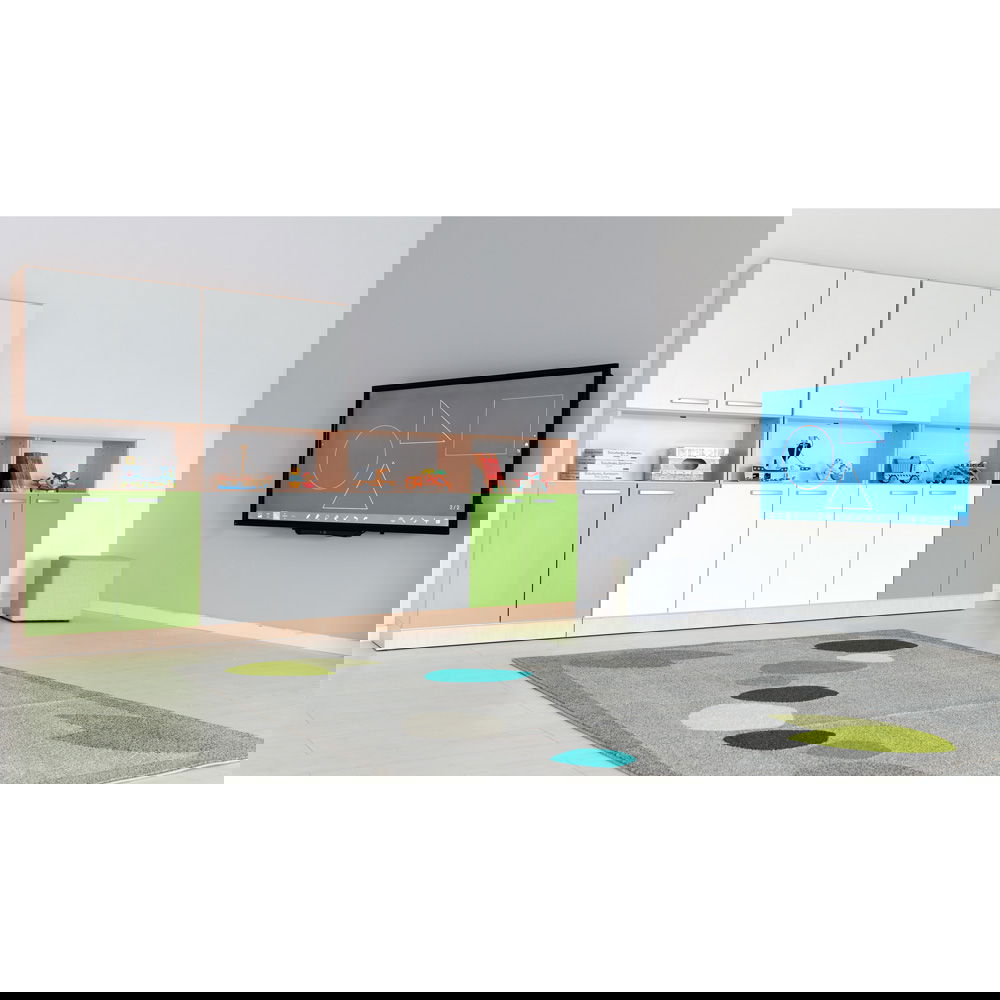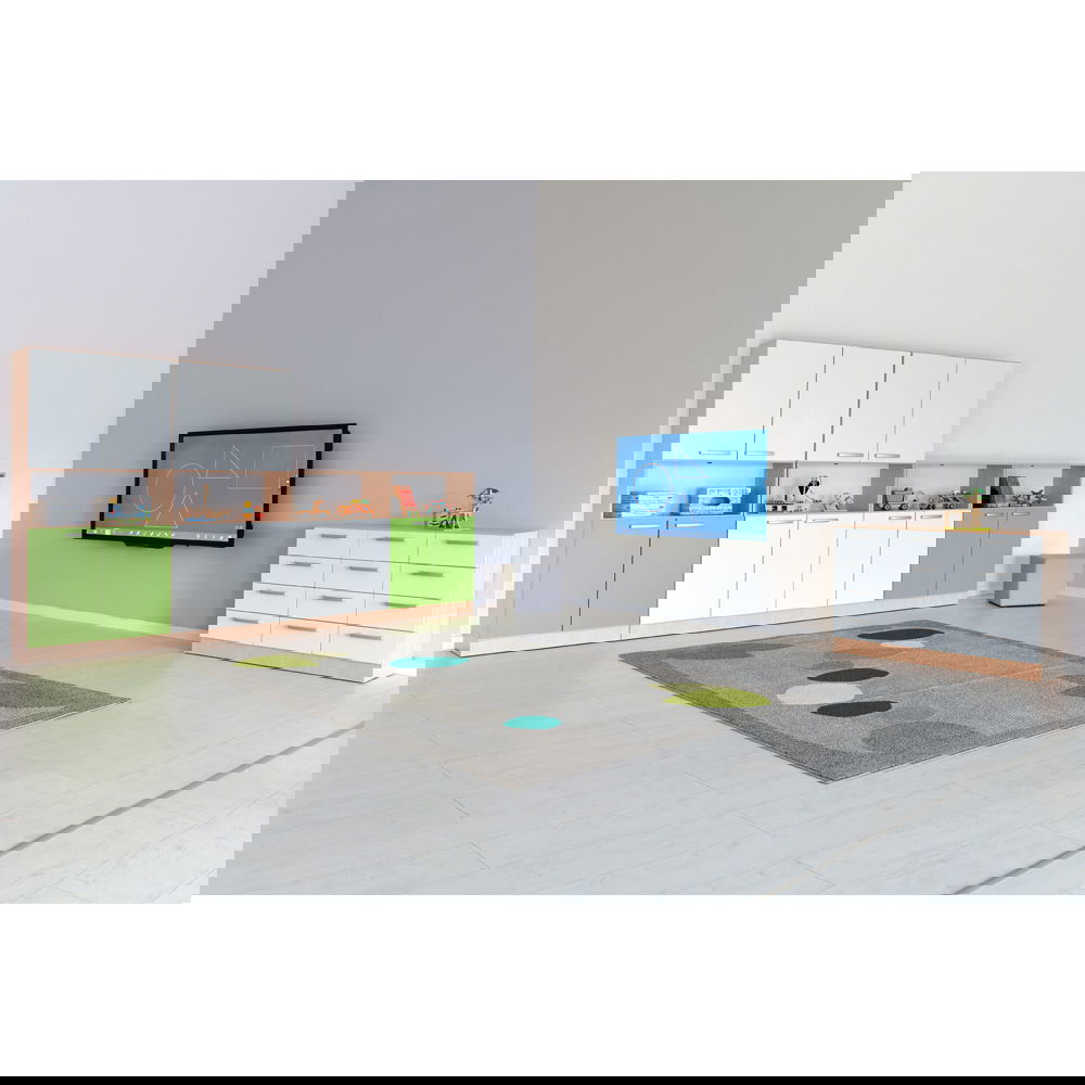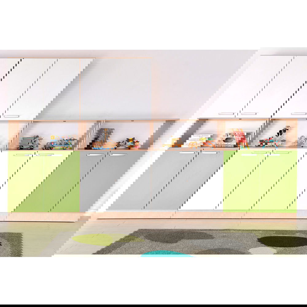 Die Stärke dieses Systems liegt in seiner durchdachten, symmetrischen Architektur, die durch den Einsatz von Türen in Weiß und Grün eine frische, freundliche Atmosphäre schafft. Durch das Spiel mit unterschiedlich hohen Schränken entsteht eine dynamische Silhouette, die bis auf eine Höhe von fast 1,90 Metern reicht und somit den vertikalen Raum optimal ausnutzt. Alle Fächer sind hinter Türen verborgen, was für eine besonders ruhige und aufgeräumte Optik sorgt. Mit seiner platzsparenden Tiefe von nur 38 cm (T 38 Serie) ist dieser Möbelsatz ideal, um auch in schmaleren Räumen oder Fluren maximalen Stauraum zu schaffen, ohne die Bewegungsfreiheit einzuschränken.