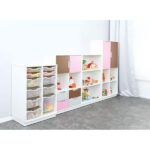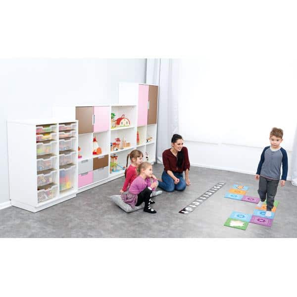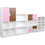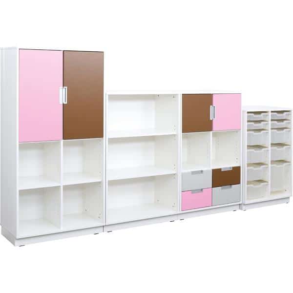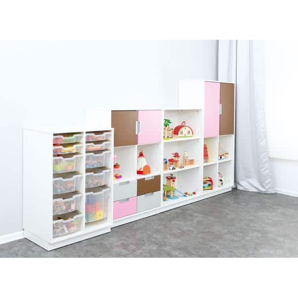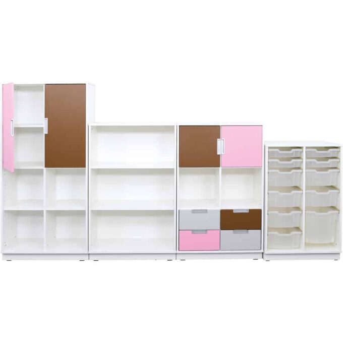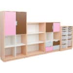 Dieser Möbelsatz bietet vielseitige Aufbewahrungslösungen durch eine Kombination aus verschiedenen Schranktypen, Schubladen und transparenten Kunststoffbehältern. Die unterschiedlichen Farben und Größen schaffen eine einladende und geordnete Umgebung für Kinder und Erwachsene.