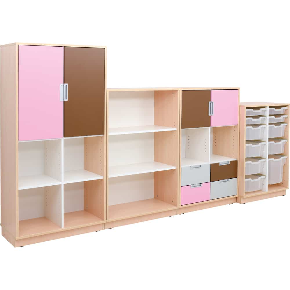 Der Möbelsatz Schrank L+M flieder/braun/grau – Quadro 91-180° bringt eine harmonische und stilvolle Aufbewahrungslösung für Kindergärten, Schulen und Zuhause. Mit einer eleganten Kombination aus Flieder, Braun und Grau sorgt dieser Möbelsatz für eine ruhige, einladende Atmosphäre und viel Stauraum.