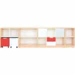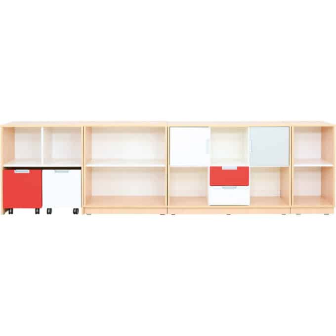 Mit verschiedenen Schrankmodulen, Schubladen und Rollbehältern bietet dieser Möbelsatz flexible Stauraumlösungen für all Ihre Bedürfnisse. Die Farbvielfalt schafft eine fröhliche Atmosphäre und organisiert Ihre Materialien perfekt.