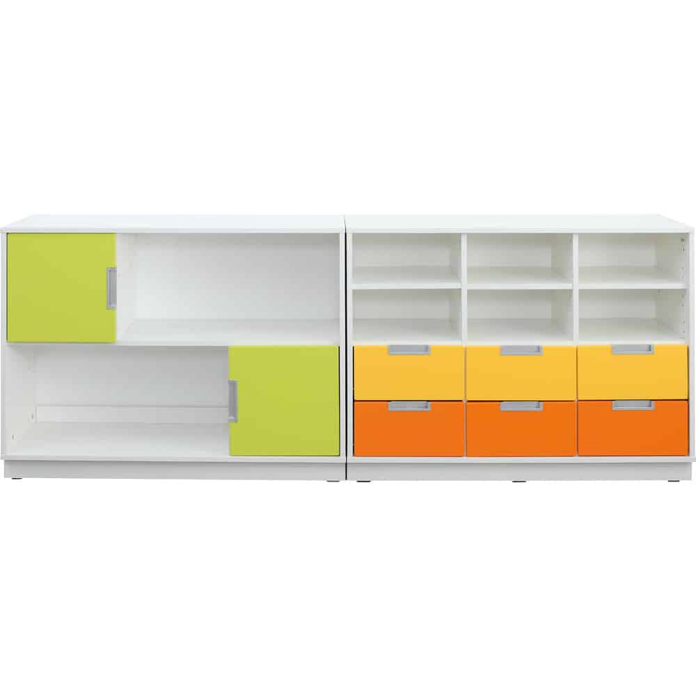 Der Möbelsatz Quadro 109-180° besteht aus unterschiedlichen Schränken und Regalen, die sich individuell kombinieren lassen. Der Satz beinhaltet Schränke mit zwei Trennwänden und drei Einlegeböden, einen asymmetrischen Schrank für breite Schubladen sowie diverse Einlegeböden und Schubladen in fröhlichen Farben wie Gelb und Orange. Die limonengrünen Türen setzen zusätzliche farbenfrohe Akzente.