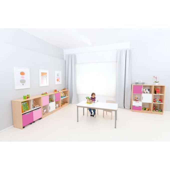 Der Möbelsatz Schrank M+L flieder/magenta – Quadro 87-180° kombiniert farbenfrohes Design mit praktischer Funktionalität und bringt eine einladende Atmosphäre in Ihre Räume. Perfekt für Kindergärten, Schulen und Zuhause, sorgt dieser Möbelsatz für Struktur und Freude.