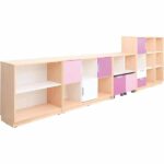 Dieser Möbelsatz bietet flexible Aufbewahrungslösungen durch verschieden große Schränke, Schubladen und Rollbehälter. Die farbenfrohen Elemente schaffen eine fröhliche und einladende Atmosphäre für alle Altersgruppen.
