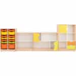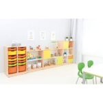 Dieser Möbelsatz bietet flexible Stauraumlösungen mit verschiedenen Schrankmodulen, Schubladen und Kunststoffbehältern. Die farbenfrohen Elemente schaffen eine fröhliche Atmosphäre und bieten viel Platz für Spielsachen, Bücher und Lernmaterialien.