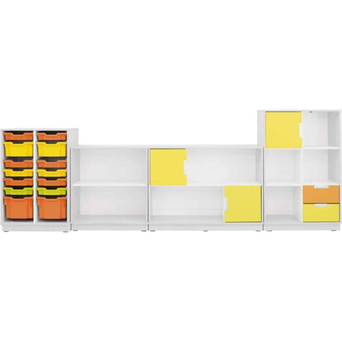 Dieser Möbelsatz bietet flexible Stauraumlösungen mit verschiedenen Schrankmodulen, Schubladen und Kunststoffbehältern. Die farbenfrohen Elemente schaffen eine fröhliche Atmosphäre und bieten viel Platz für Spielsachen, Bücher und Lernmaterialien.