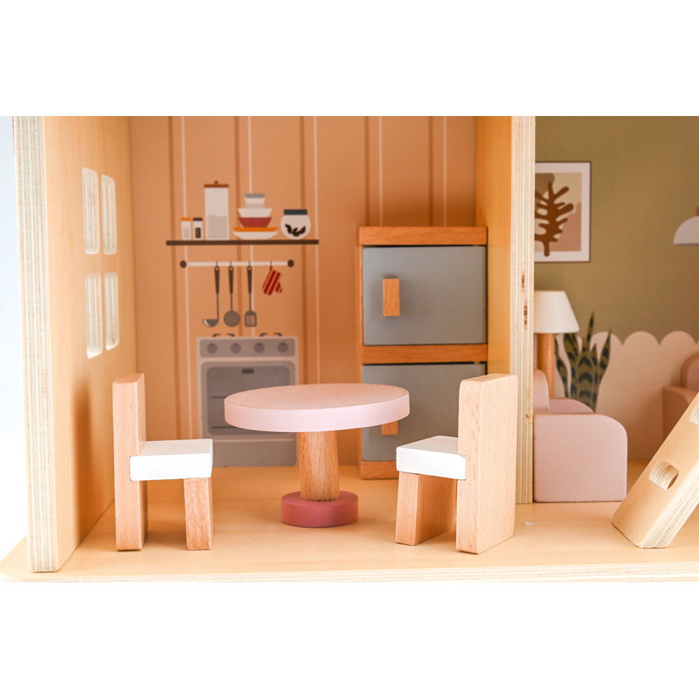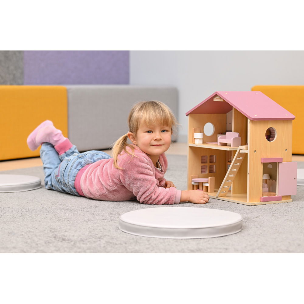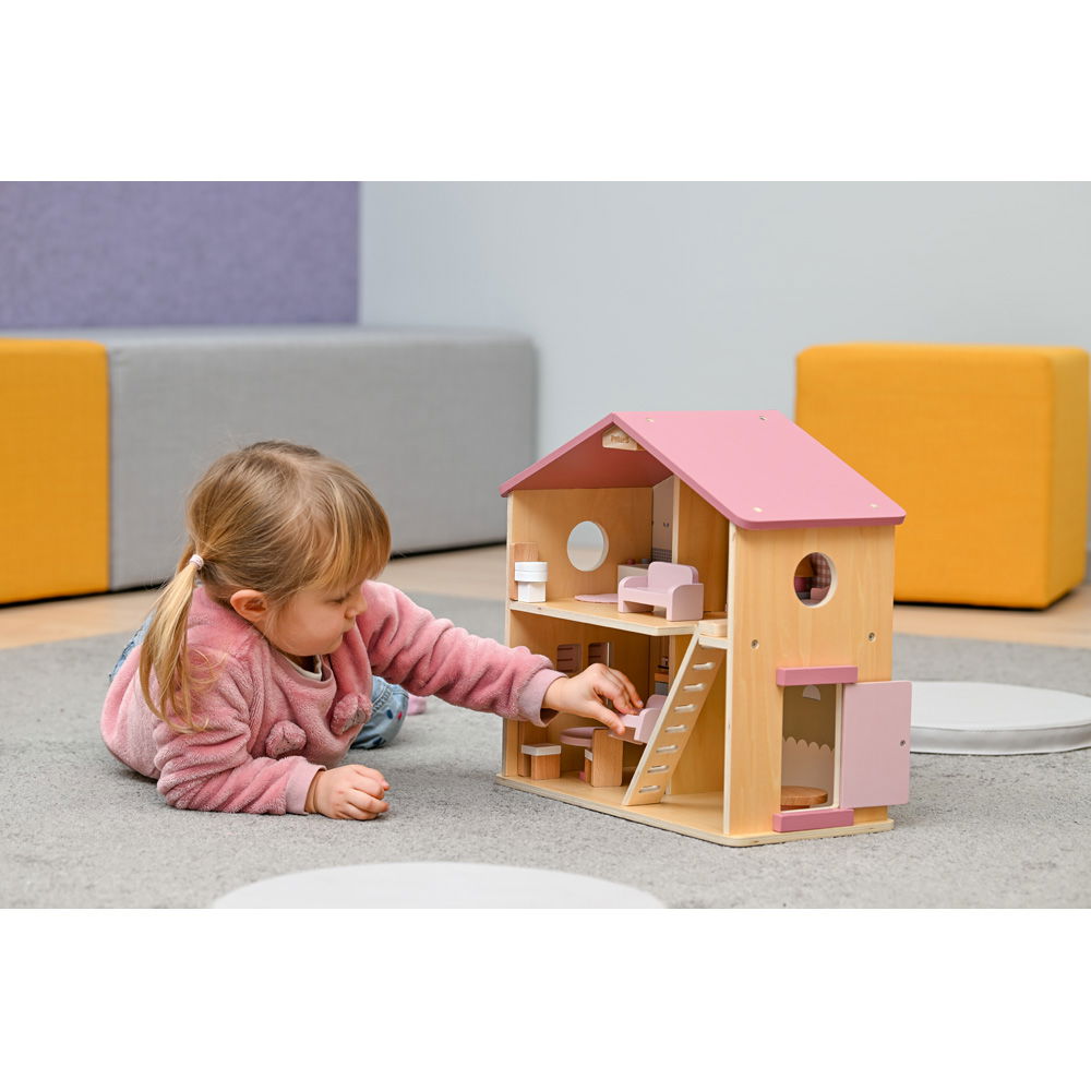 Entdecken Sie das möblierte Puppenhaus in Rosa aus Holz. Mit 17 Teilen auf 2 Etagen fördert es Kreativität und Feinmotorik. Für fantasievolles Spielen.