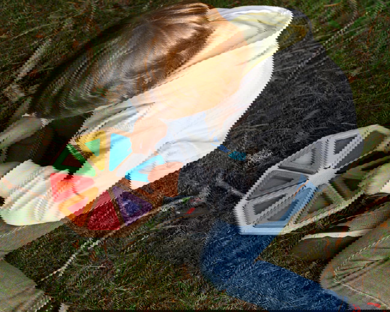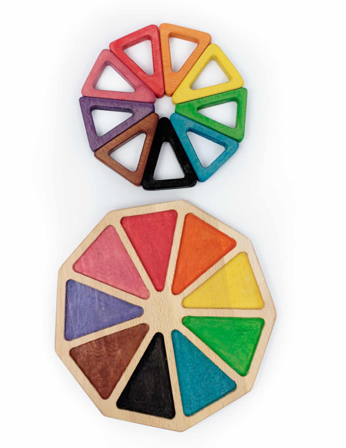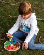 Der Montessori Farbkreis hilft Ihrem Kind, Farben zu sortieren und zu vergleichen. Mit den 9 Farbfächern – orange, rot, rosa, lila, hellbraun, schwarz, blau, grün und gelb – können Kinder spielerisch die unterschiedlichen Farbtöne kennenlernen. Über das gewählte Objekt gehalten, fungieren die Farbdreiecke als eine Art „Farbsuch-Lupe“, mit der die Farben in der Natur viel leichter erkannt und eingeordnet werden können, beispielsweise bei einem Gänseblümchen, das in der Regel weiß, gelb und grün ist.