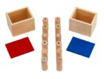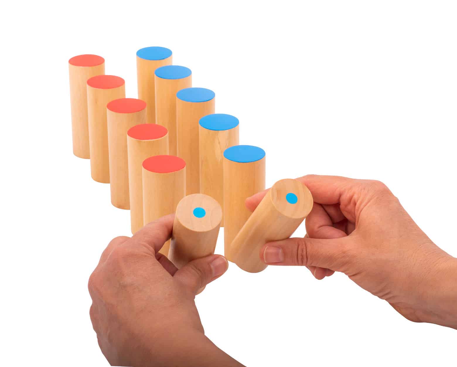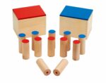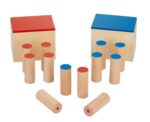 Das Set enthält 12 Holzzylinder mit rotem und blauem Deckel. Jeder Zylinder erzeugt beim Schütteln denselben Klang, wodurch die Kinder herausgefordert werden, die passenden Geräuschpaare zu finden. Diese Interaktion fördert die Aufmerksamkeit und schult das auditive Gedächtnis sowie die Fähigkeit, Geräusche zu erkennen und zu benennen.