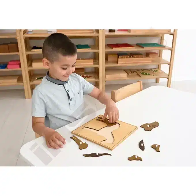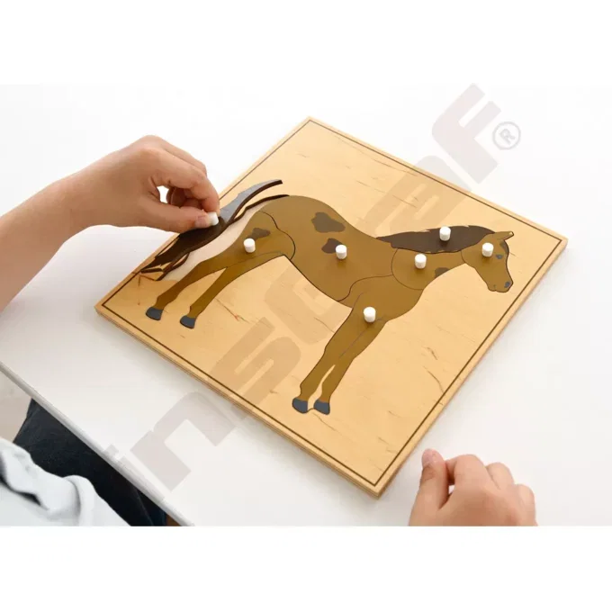 Das Montessori Tierpuzzle – Pferd ist eine großartige Möglichkeit für Kinder, den Körperbau eines Pferdes zu erkunden und zu lernen. Dieses hochwertige Holzpuzzle besteht aus 7 Teilen, die Kinder nach Herzenslust einlegen und benennen können. Jedes Puzzleteil ist mit einem Griff ausgestattet, der das Herausnehmen und Einsetzen erleichtert und die Feinmotorik fördert.