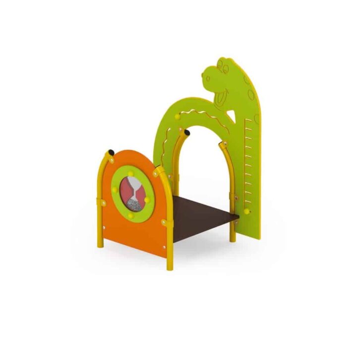 Das Motorik-Spiel Dino 1 mit Plattform und Motorikelementen plus Krabbeltunnel.