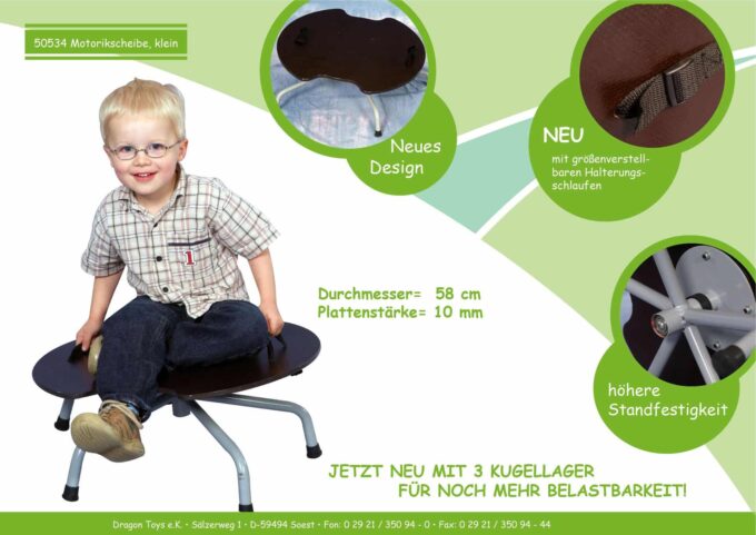 Die Motorik Drehscheibe ist ein unterhaltsames Trainingsgerät für Kinder, um spielerisch ihre Körperbalance, Gleichgewicht und Körperspannung zu verbessern. Sie kann im Sitzen, Liegen oder auf den Knien genutzt werden und bietet eine Vielzahl von Übungen und Bewegungsmöglichkeiten.