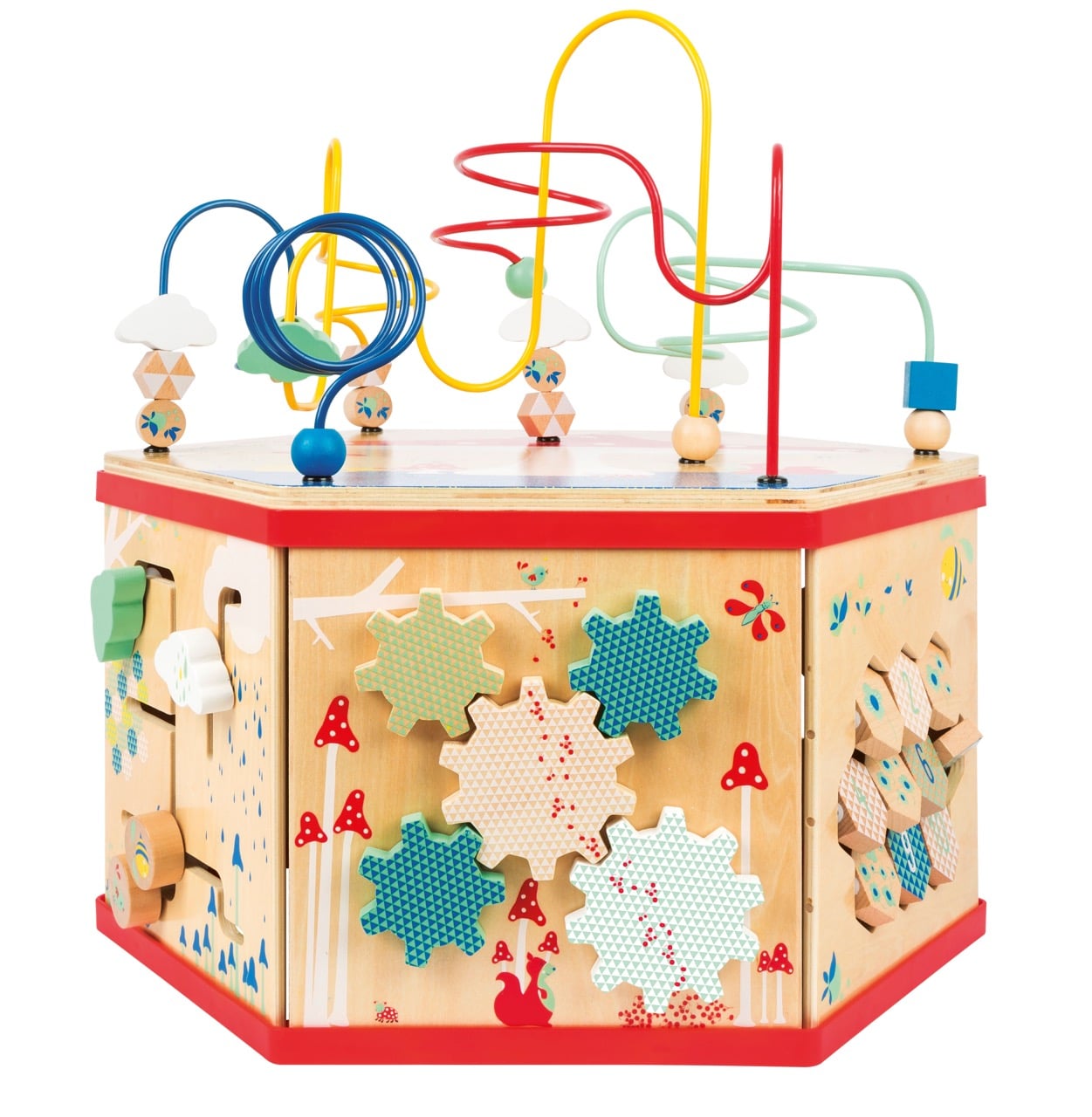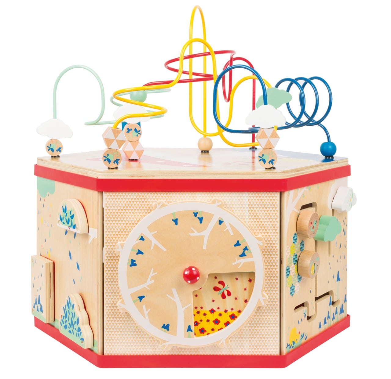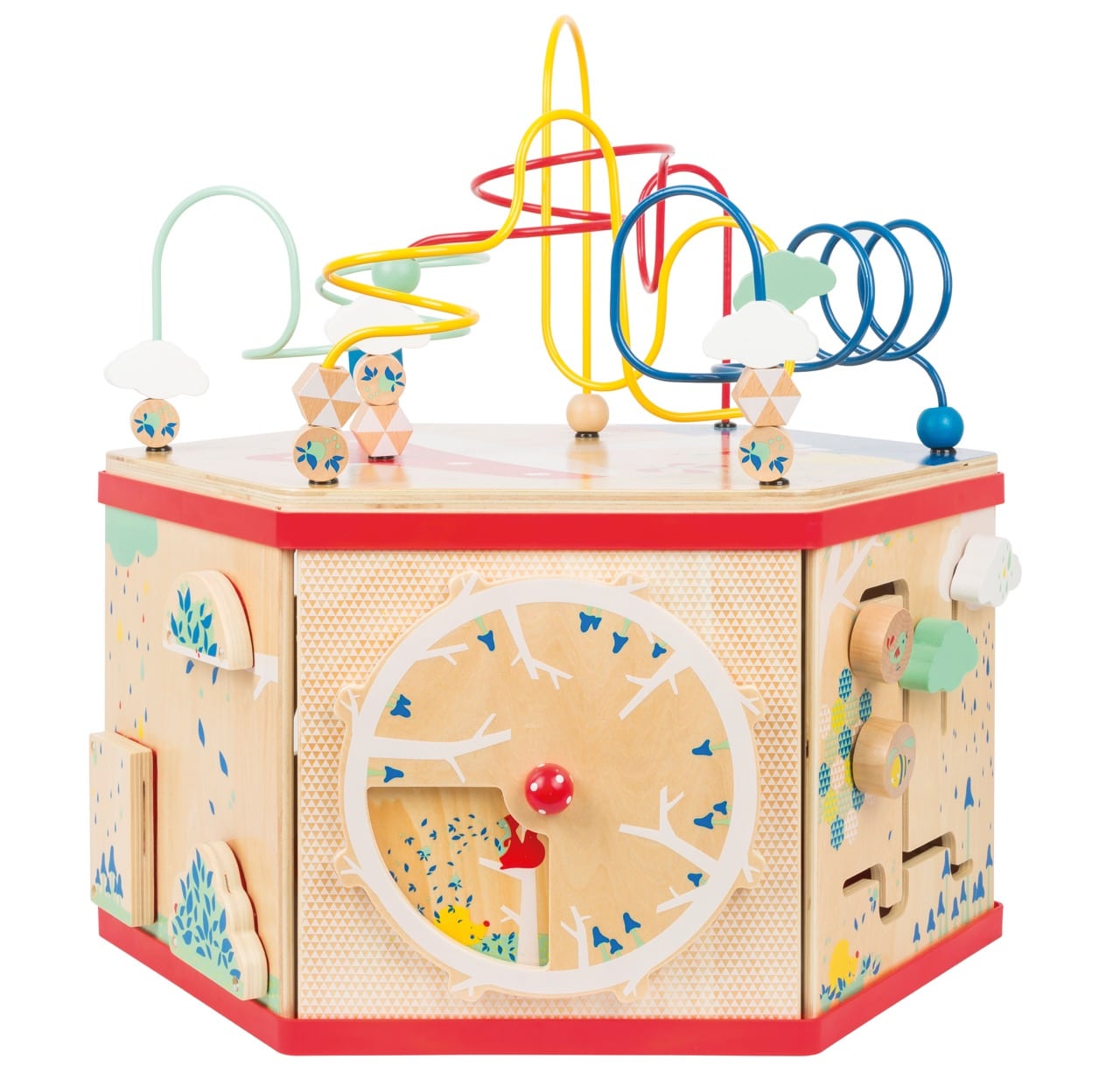 - Hauptaktivitäten: Große Motorikschleife (auf abnehmbarem Deckel), Rädchenspiel mit Zahnrädern, Labyrinth, Suchspiel mit Tieren, Jahreszeitenuhr, Zahlen-Memo-Spiel
