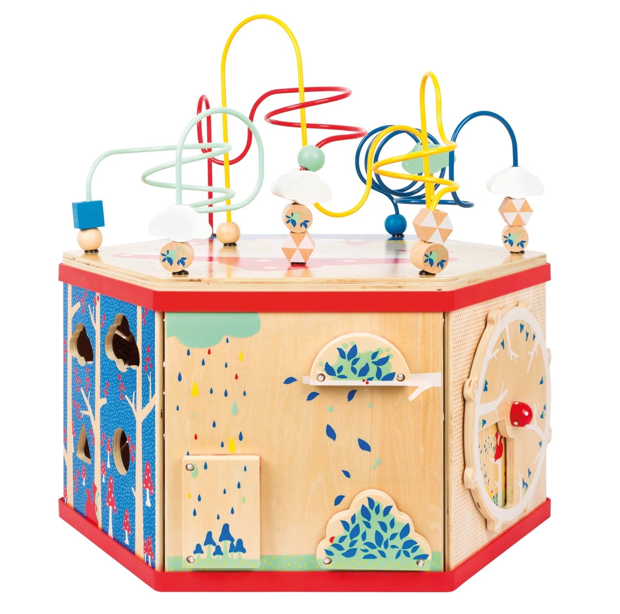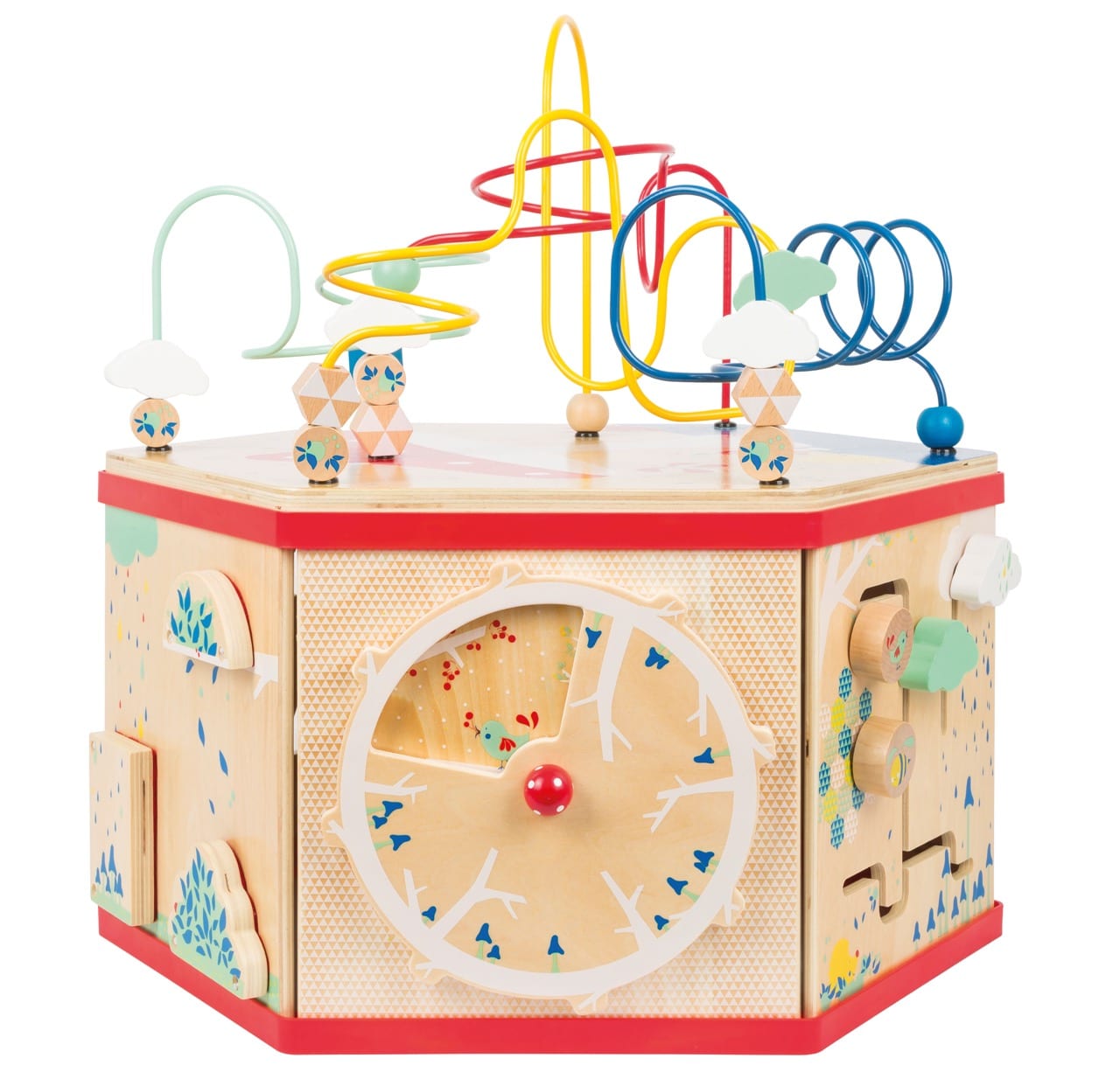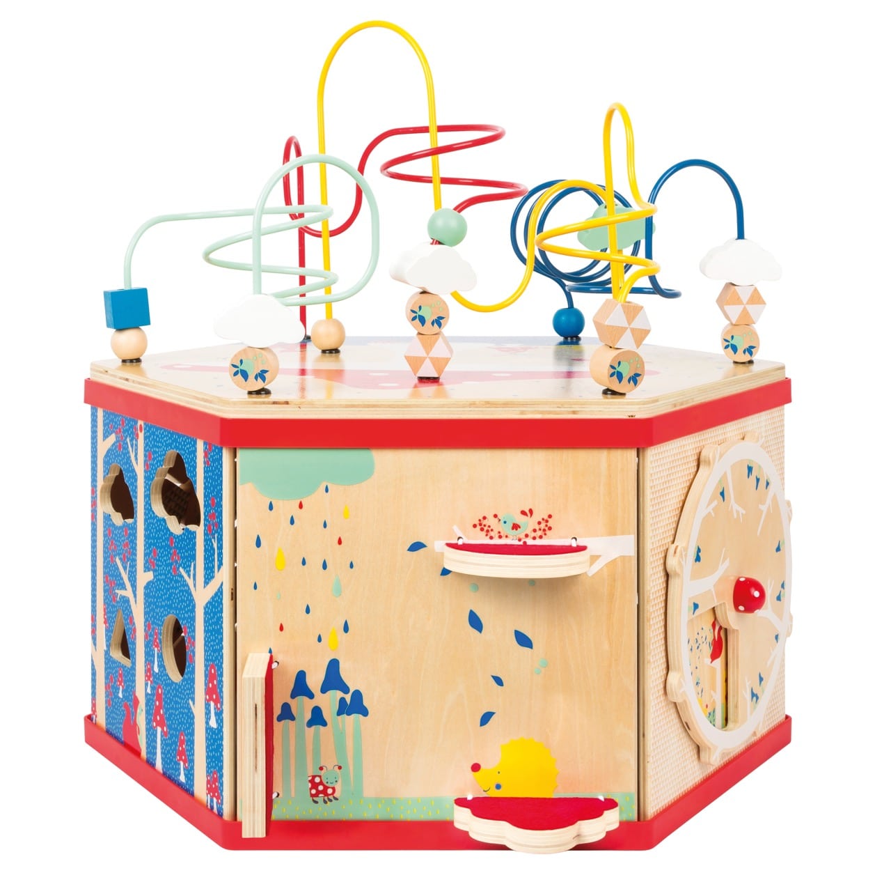 - Hauptaktivitäten: Große Motorikschleife (auf abnehmbarem Deckel), Rädchenspiel mit Zahnrädern, Labyrinth, Suchspiel mit Tieren, Jahreszeitenuhr, Zahlen-Memo-Spiel