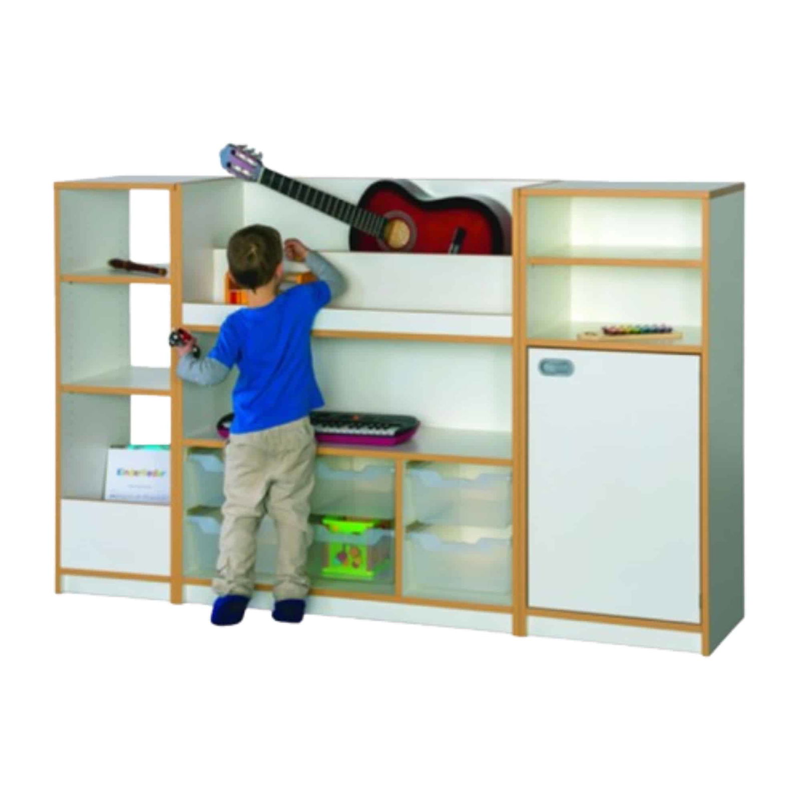 - Zentrales Instrumentenregal: Ausgestattet mit 6 transparenten Kunststoffschüben für Kleininstrumente, einem großen Mittelfach für Trommeln und einem sicheren Gitarrenfach mit Abrutschsicherung.