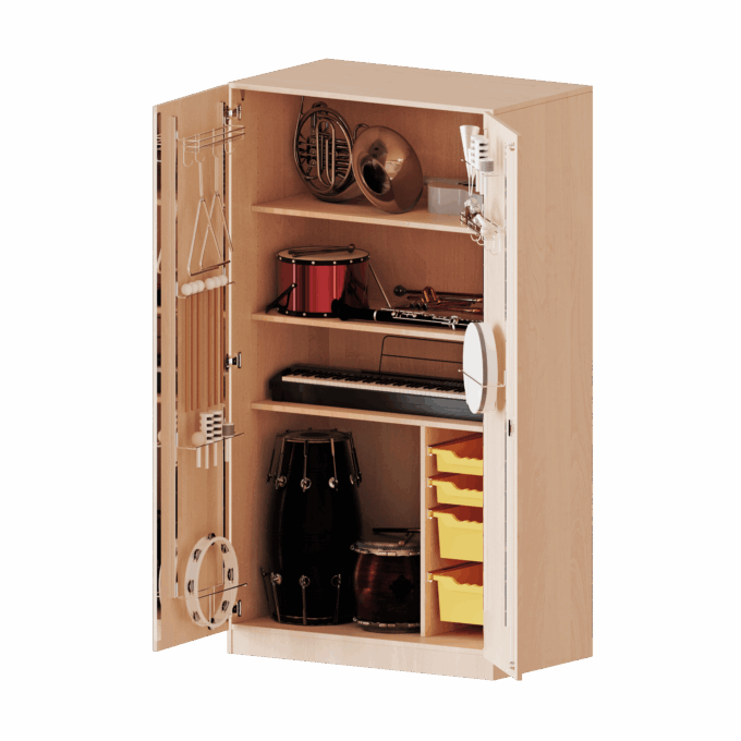 - Intelligente Innenaufteilung: Der Schrank ist mit zwei verstellbaren Einlegeböden, praktischen Instrumentenhalterungen an den Türinnenseiten und vier ErgoTray Boxen (zwei hohe, zwei flache) ausgestattet. Dieses System ermöglicht eine perfekte Organisation von Notenordnern, Kleininstrumenten und losem Zubehör.