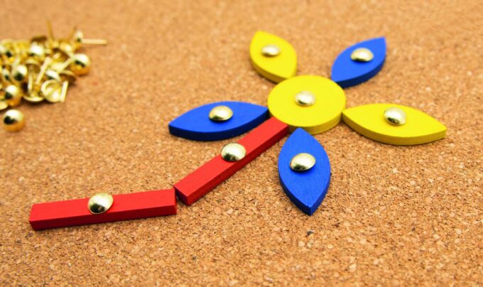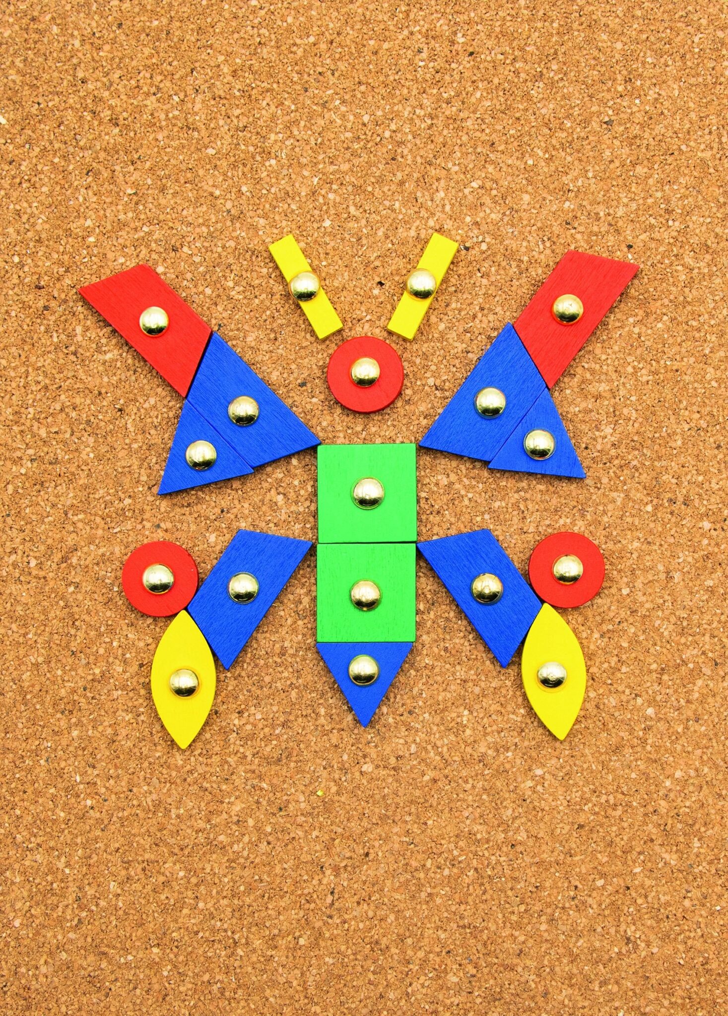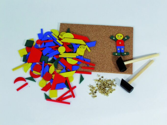 Kreative Köpfchen aufgepasst – das Nagelspiel Komplett – Set lädt zum Hämmern und Gestalten ein! Das Gruppen-Box Set ist perfekt für kleine Handwerker, die mit Fantasie und Geschick bunte Bilder und Muster erschaffen möchten. Die weiche Korkplatte dient als sicherer Untergrund, während die Hämmerchen und Nägel leicht in die Hand kleiner Künstler passen. Mit ca. 600 Holzteilen in verschiedenen Formen und Farben können die Kinder ihrer Kreativität freien Lauf lassen.