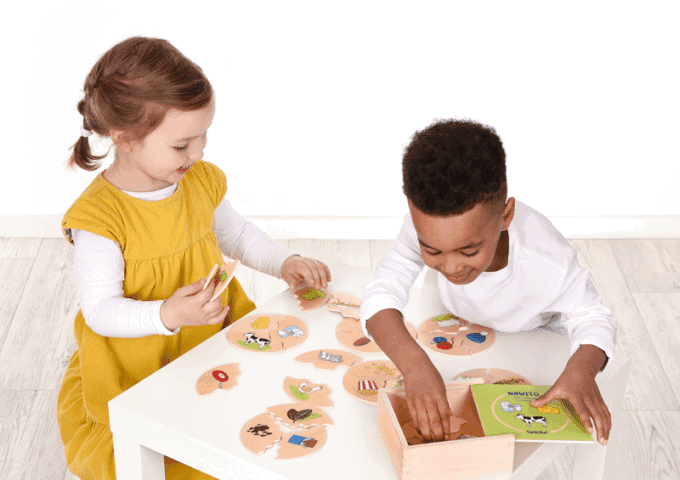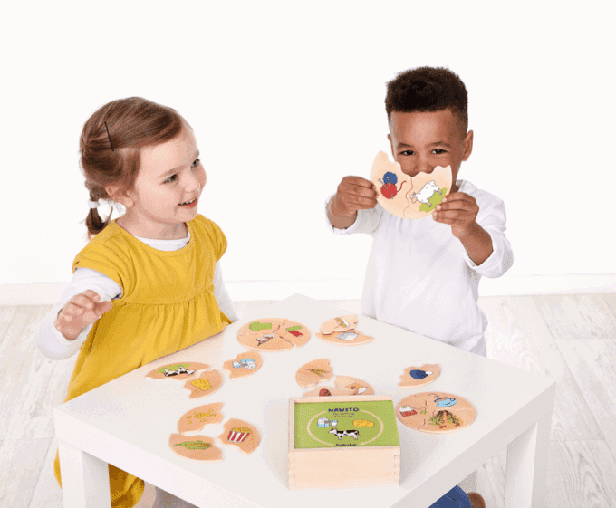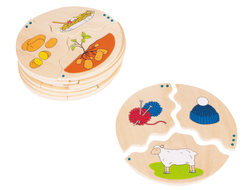 Durch das NAWITO Zuordnungspuzzle „Herstellung“ lernen Kinder auf spielerische Weise, wie alltägliche Dinge gemacht werden. Dieses interaktive Puzzle hilft ihnen zu verstehen, woher zum Beispiel die Milch kommt oder was aus Kartoffeln hergestellt wird.