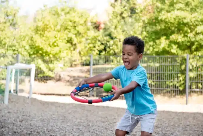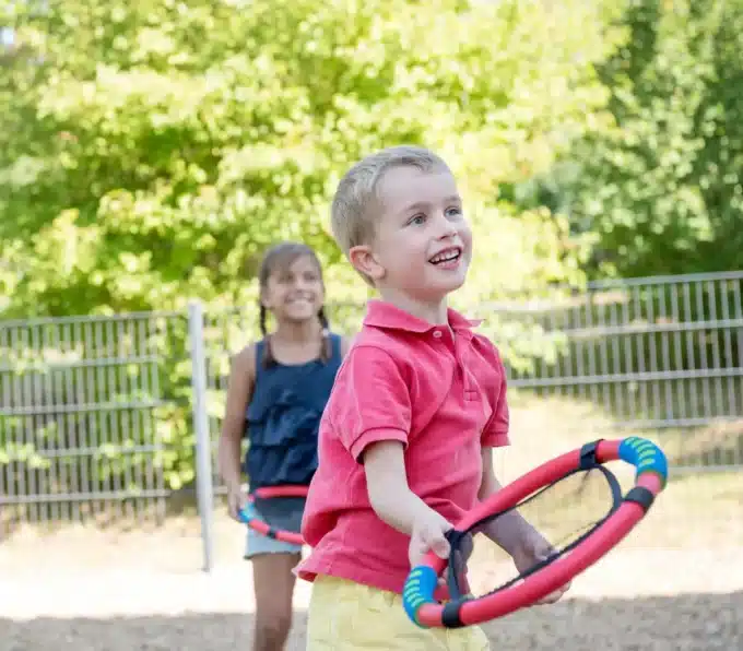 Das innovative Design der Handtrampoline ermöglicht den sogenannten “Trampolineffekt”, der durch das schwarze Gitternetz der Schlagringe entsteht. Dadurch fliegen die Bälle geschmeidig von Spieler A zu Spieler B. Unter Aufsicht können die Kinder spannende Netzball-Matches spielen und dabei Teamgeist und Fair Play lernen!