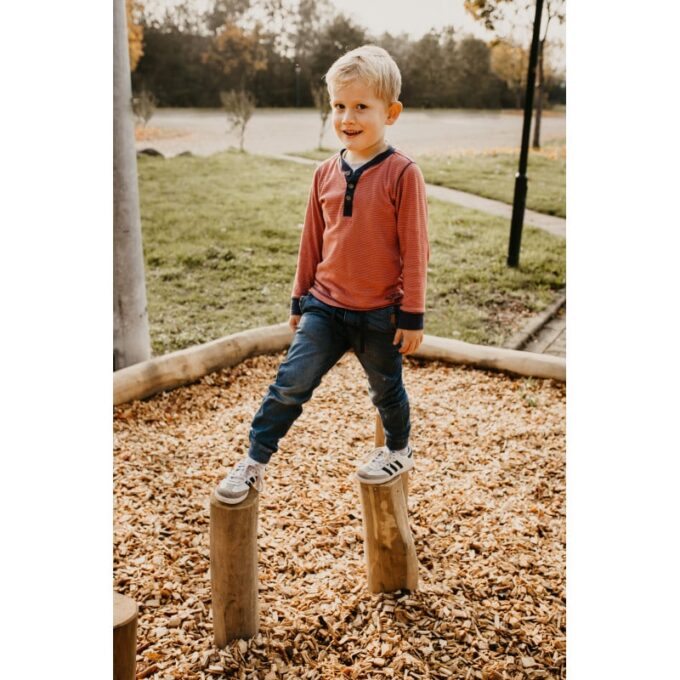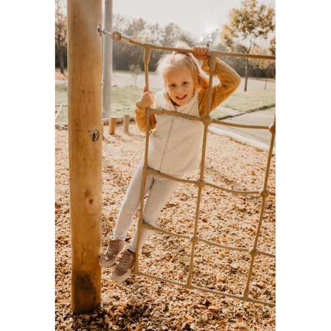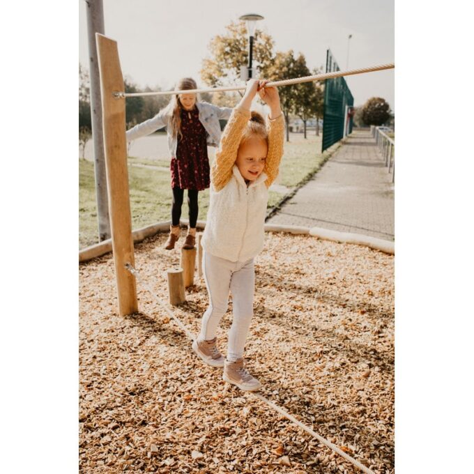 „Immer in Balance“: Mit dieser Niedrig-Kletteranlage können Kinder ganz sicher erste Balancier- und Klettererfahrungen machen. Selbst bei einem Ausrutscher kann hier nicht viel passieren. Dafür sorgt die niedrige Fallhöhe von ca. 95 cm, durch die in Deutschland Oberboden als Fallschutz ausreicht. Somit sind bei Naturböden in der Regel keine aufwändigen Erdarbeiten erforderlich, um die Sicherheitsvorgaben der DIN EN 1176 zu erfüllen.