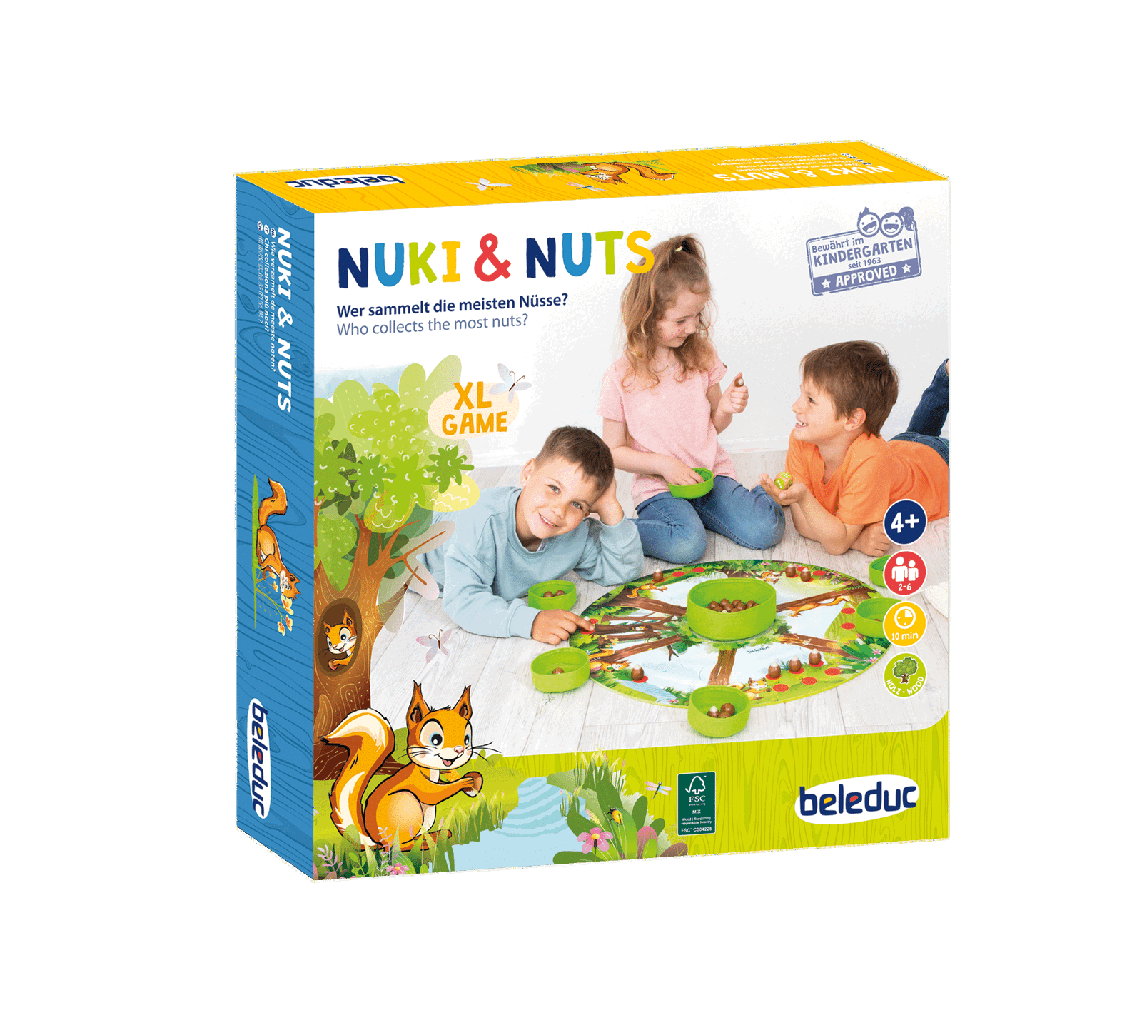 Der Wald erwacht und die fleißigen Eichhörnchen machen sich bereit für eine wichtige Mission: Nüsse sammeln für den großen Wintervorrat! Mit dem liebevoll gestalteten Lernspiel „Nuki & Nuts“ tauchen Kinder in die Welt des neugierigen Eichhörnchens Nuki und seiner Freunde ein. Wer ist am flinksten und wer hat am Ende die meisten Nüsse in seinem Versteck gesammelt? Dieses XL-Spiel kombiniert ein zusammensteckbares Spielfeld mit hochwertigen Holz- und Filzmaterialien und verwandelt erstes Zählen in ein spannendes Waldabenteuer.