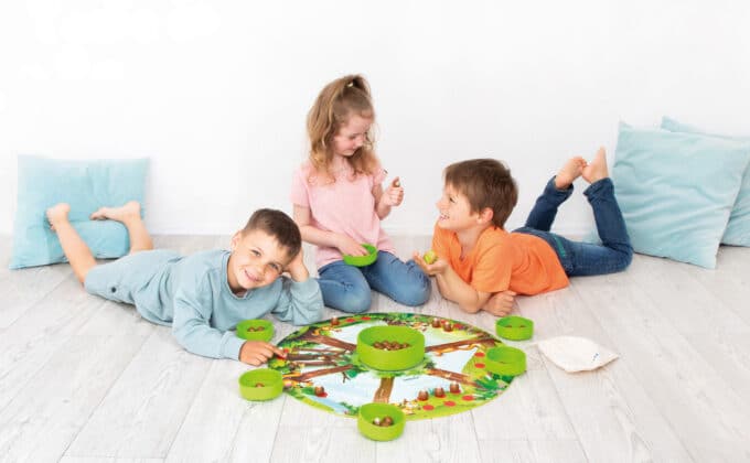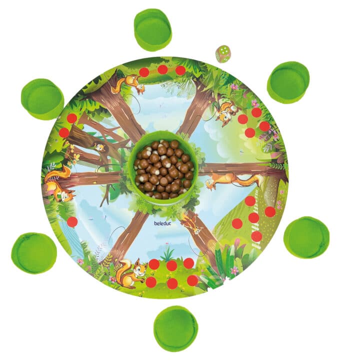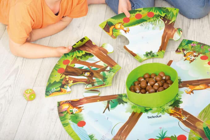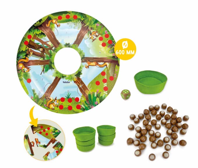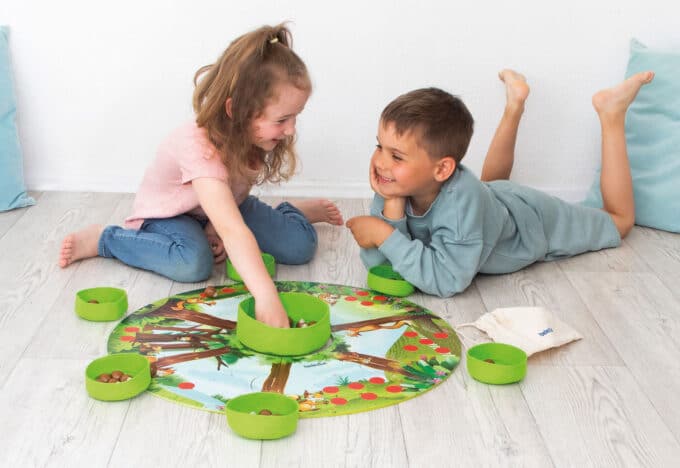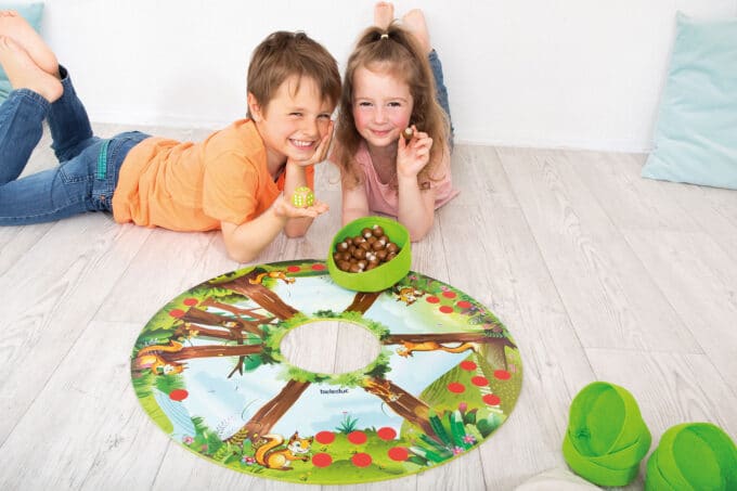 - Mengenverständnis entwickeln: Das Spiel macht Mengenverhältnisse greifbar. Kinder sehen und fühlen, wie ihr Vorrat wächst. Fragen wie „Wer hat mehr Nüsse?“ oder „Wie viele fehlen dir noch?“ fördern das Vergleichen von Mengen.
