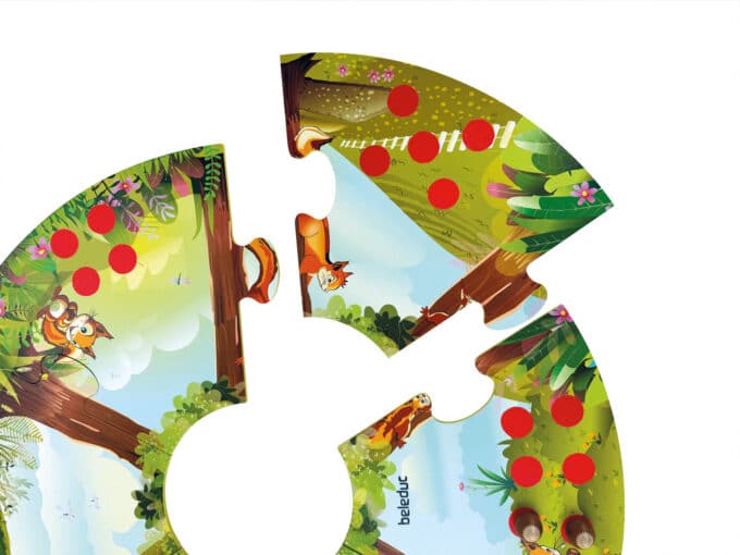Bei diesem Spiel würfeln bis zu sechs kleine Eichhörnchen-Freunde und sammeln die entsprechende Anzahl an Nüssen in ihren eigenen Filzkörbchen. Es ist ein spielerischer Wettlauf, der nicht nur Spaß macht, sondern auch grundlegende mathematische Fähigkeiten und die Feinmotorik fördert. Das große, runde Spielfeld, das aus sechs Puzzleteilen zusammengesetzt wird, schafft eine einladende Atmosphäre und macht „Nuki & Nuts“ zu einem idealen Gemeinschaftsspiel für den Kindergarten oder die Familie.