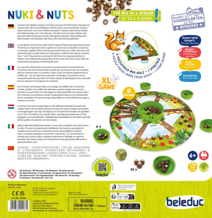 Der Wald erwacht und die fleißigen Eichhörnchen machen sich bereit für eine wichtige Mission: Nüsse sammeln für den großen Wintervorrat! Mit dem liebevoll gestalteten Lernspiel „Nuki & Nuts“ tauchen Kinder in die Welt des neugierigen Eichhörnchens Nuki und seiner Freunde ein. Wer ist am flinksten und wer hat am Ende die meisten Nüsse in seinem Versteck gesammelt? Dieses XL-Spiel kombiniert ein zusammensteckbares Spielfeld mit hochwertigen Holz- und Filzmaterialien und verwandelt erstes Zählen in ein spannendes Waldabenteuer.