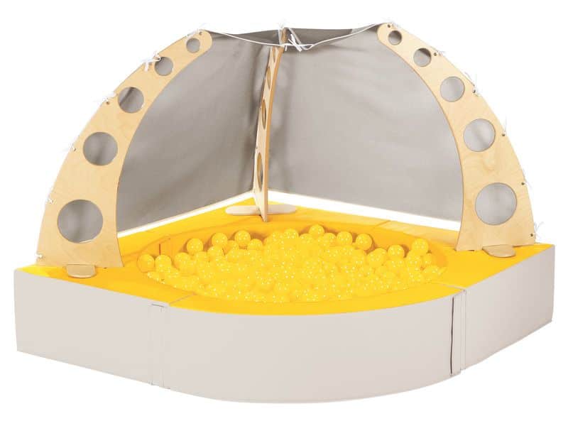 - Produkt-Aufbau: 3 Eckteile, 1 Viertelkreisteil, 3 Holzpfosten, 2 einfache Bezüge, 250 undurchsichtige Bälle und 250 durchsichtige Bälle.