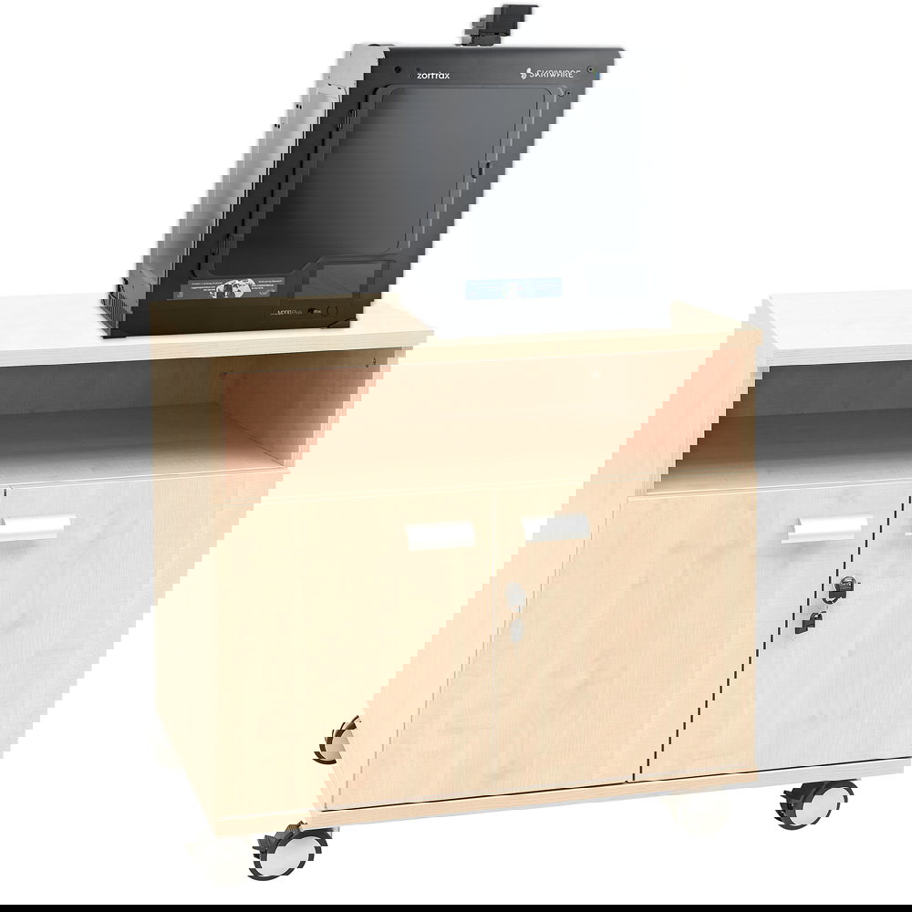 Unter dem offenen Fach bietet ein abschließbarer Schrank weiteren Stauraum. Hier können Sie teure Toner-Kartuschen, Ersatzteile oder Bedienungsanleitungen staubgeschützt und sicher vor unbefugtem Zugriff lagern. Dies hilft nicht nur bei der Inventur, sondern sorgt auch für ein aufgeräumtes Erscheinungsbild, da kleinteiliges Zubehör aus dem Sichtfeld verschwindet. - Einheitliches Design für Ihr Büro