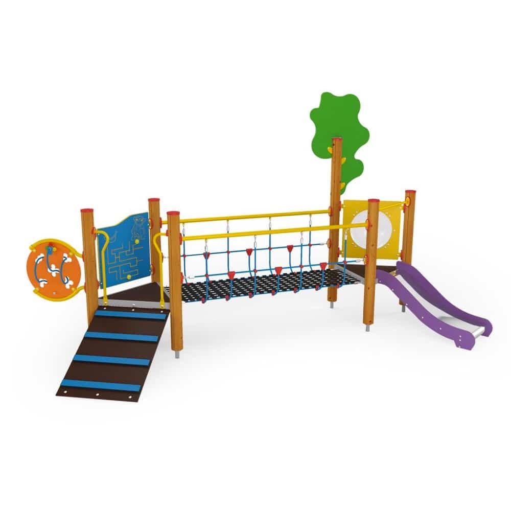 Das Orbis Mini II U3-Spielpodest 11238 wurde für die jüngsten Benutzer von Spielplätzen entwickelt. Sie Spielanlage verfügt über eine Rutsche, einen kleinkinderfreundlichen Aufgang, eine Hängebrücke, Kletterbaum, mehrere Motorikelemente und zwei Podeste.