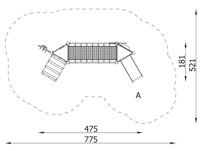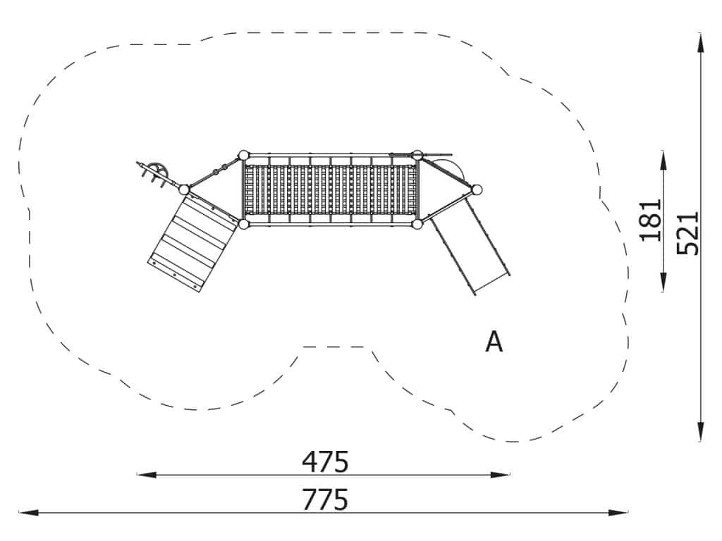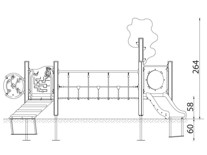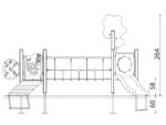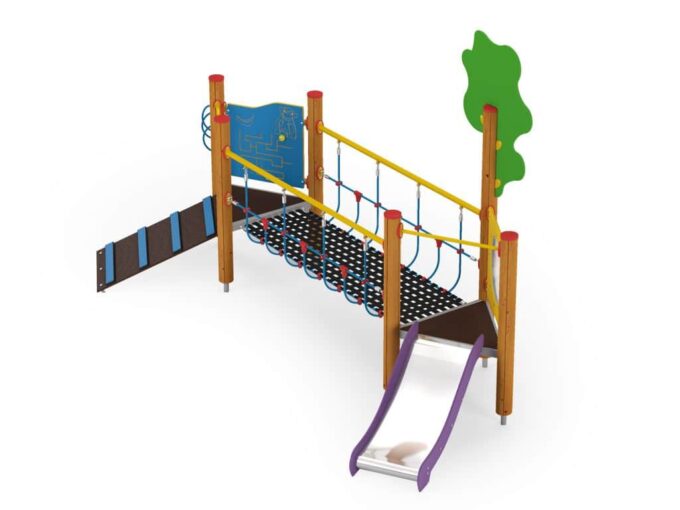 - Material: Lagerpfosten haben einen Durchmesser von 12 cm und bestehen aus verleimtem, rundem Holz, das 10 cm über dem Boden mit Metalldübeln befestigt wird. Rutschfeste Plattformen. Dächer, Sicherheitselemente und Paneele bestehen aus HDPE-Platten (hochfestes Polyethylen) mit Musterzuschnitten. Gleitfläche aus säurebeständigem Edelstahlblech. Seile aus Polypropylen mit Stahleinlage, Stärke 16-18 mm, vandalismus- und UV-beständig. Alle Beschläge und Anschlüsse sind witterungs- und UV-beständig. Holzelemente werden geölt oder mit einer Farblasur überzogen. Stahlelemente sind durch Zinkschicht und Pulverlackierung vor Korrosion geschützt.