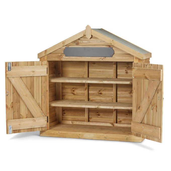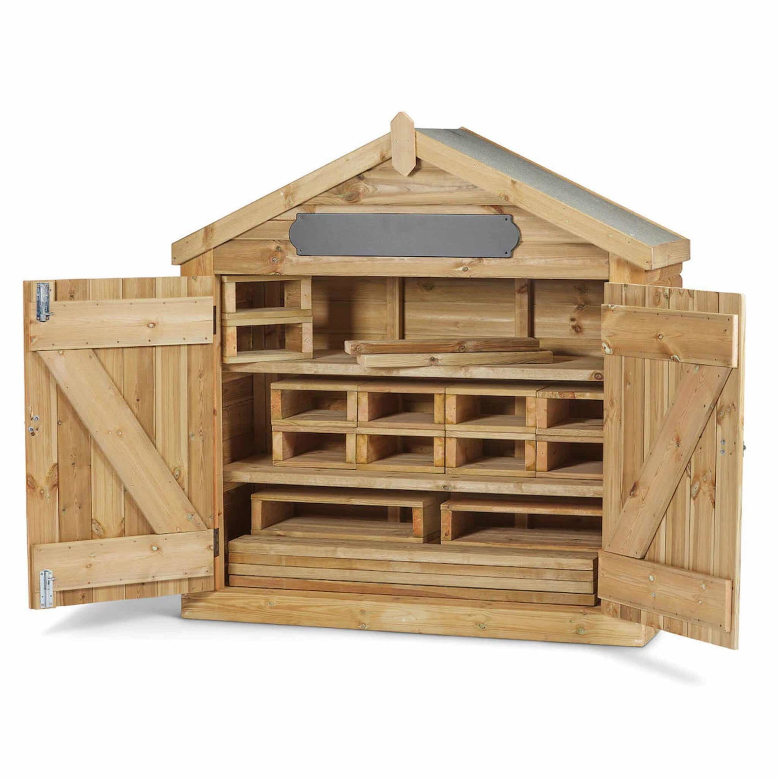 Der Innenraum der Hütte lässt sich individuell anpassen. Sie verfügt über drei Regalböden, wobei die beiden oberen herausnehmbar sind.- Große Gegenstände: Entfernen Sie die Böden, um Platz für sperrige Dinge wie Fahrzeuge, große Bausteine oder Gartengeräte zu schaffen.