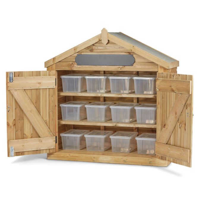 - Variante 2: Hütte mit 12 Boxen: Perfekt für die organisierte Lagerung von „Loose Parts“, Naturmaterialien oder kleineren Spielsachen. Die transparenten Boxen ermöglichen einen schnellen Überblick über den Inhalt.