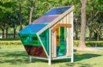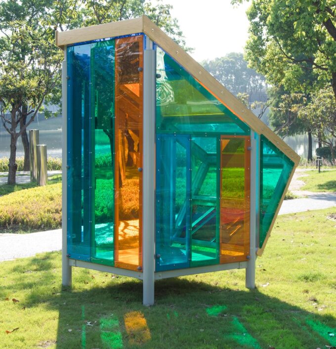 - Bunte Polycarbonat-Scheiben an den Seiten und im Dach erzeugen lebendige Lichtreflexe.