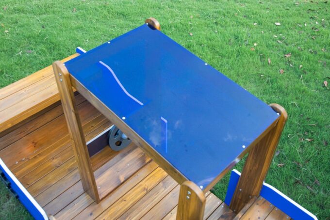 Das geräumige Dach aus blauem Polycarbonat schützt die kleinen Fischer vor Sonne und Regen, sodass sie bei jeder Wetterlage spielen können. Die Kombination aus Langlebigkeit und Funktionalität macht das Boot zu einer hervorragenden Investition für jede Kindertagesstätte.