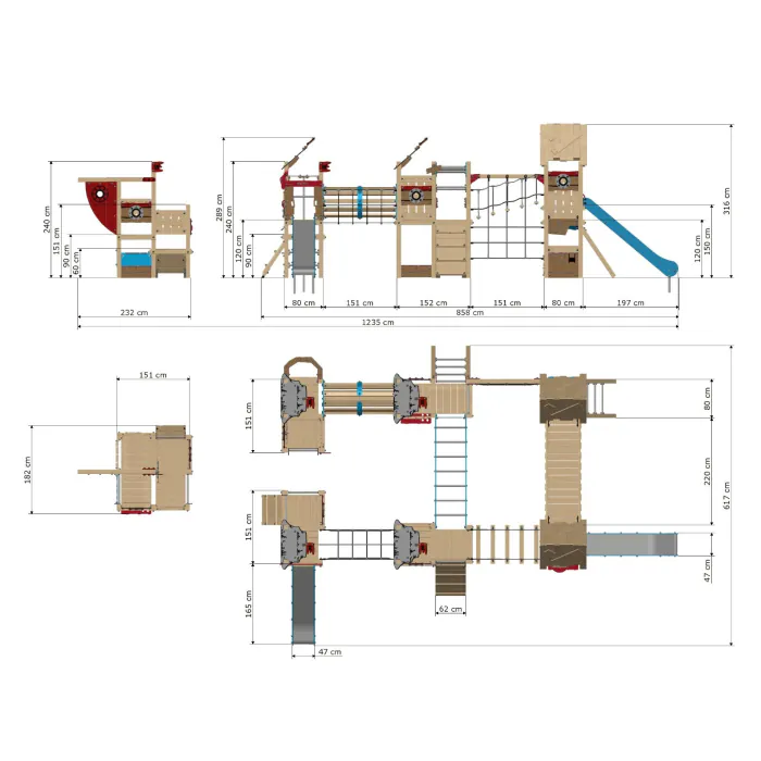 Die Lieferung erfolgt mit allen benötigten Materialien und einer detaillierten Aufbauanleitung, sodass Sie das Spielgerät schnell und unkompliziert auf Ihrem Spielplatz installieren können. Um optimale Passgenauigkeit und Stabilität zu gewährleisten, kann es erforderlich sein, einige Holzelemente selbst zu bohren.
