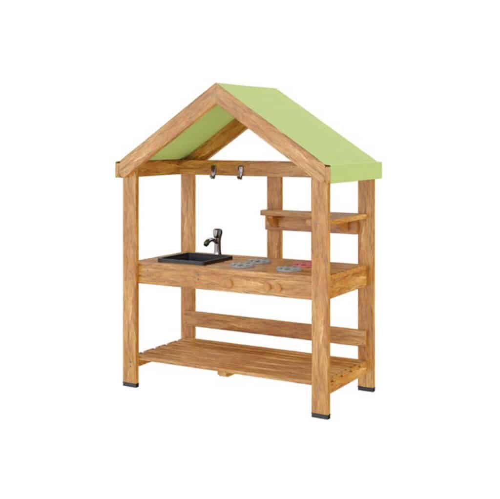 Das stabile Dach spendet Schatten und schützt vor leichtem Regen, sodass die Outdoor-Spielküche ganzjährig im Außenbereich genutzt werden kann. Durch die hohe Qualität der Materialien und die sorgfältige Verarbeitung steht sie für Langlebigkeit, Sicherheit und pädagogischen Mehrwert.